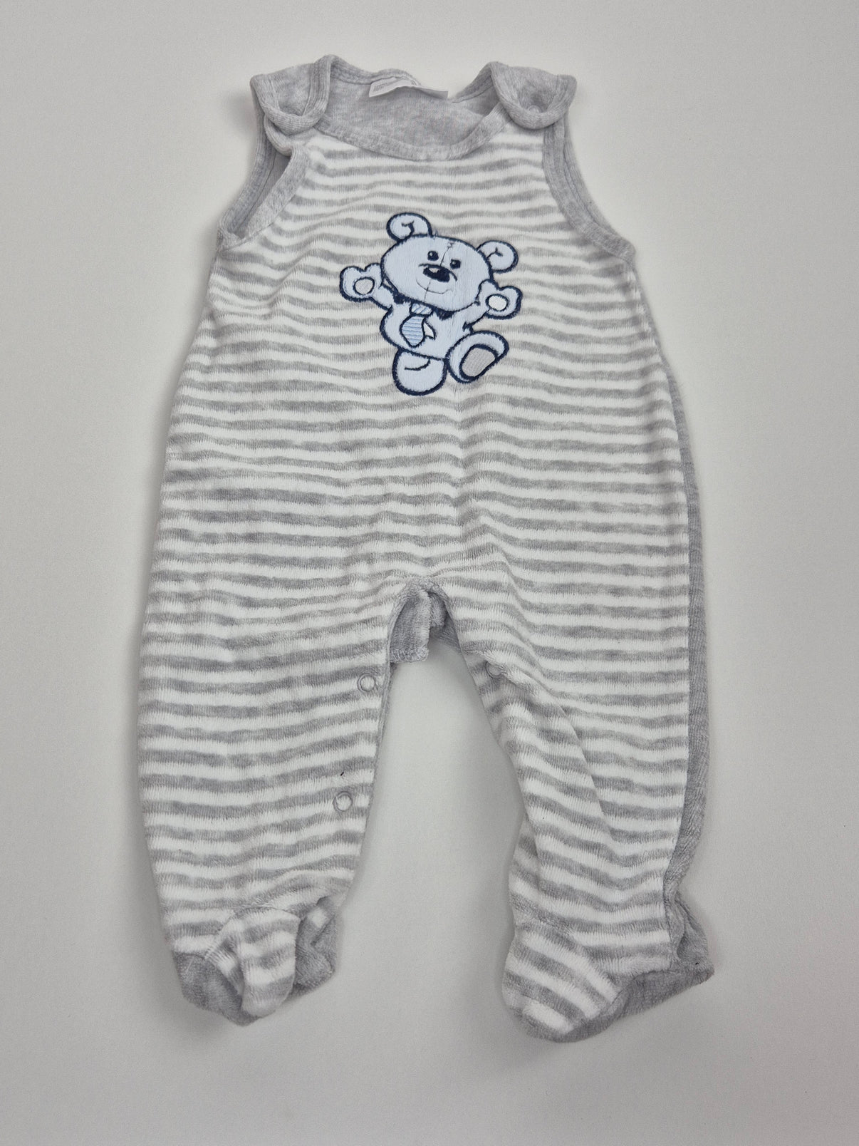 Měkké kojenecké dupačky Ergee v šedobílém proužku s roztomilou výšivkou modrého medvídka na přední straně. Praktické zapínání na patentky na ramínkách a mezi nohama usnadňuje oblékání i přebalování. Pohodlný střih s uzavřenými chodidly udrží miminko v teple.