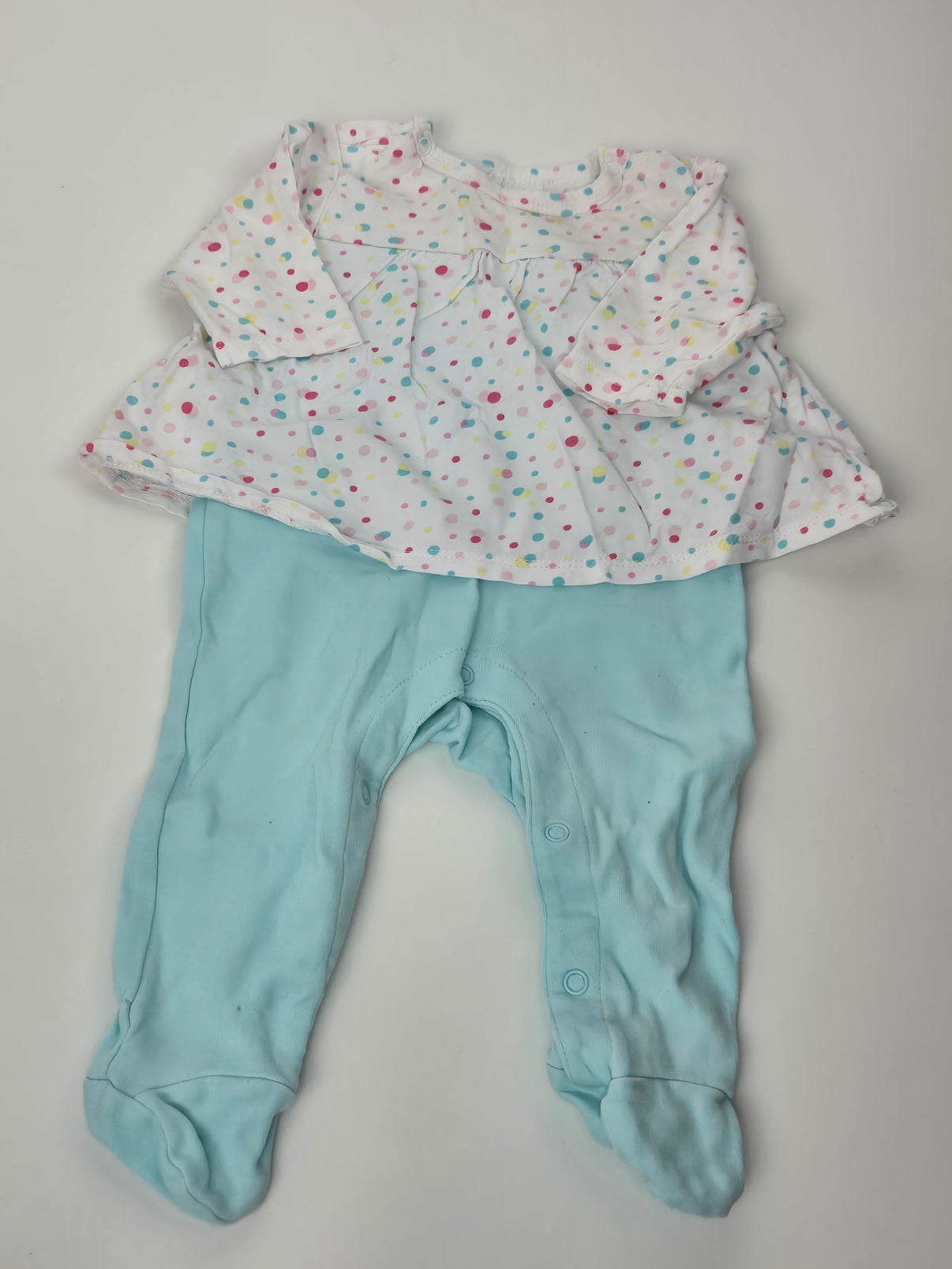 Roztomilý overal s dojmem šatiček značky Ergee v sobě spojuje praktičnost i styl. Horní díl s dlouhým rukávem v bílé barvě s barevnými puntíky působí jako šatičky, zatímco spodní část v jemně tyrkysové barvě zajišťuje teplo a pohodlí díky integrovaným nožičkám. Zapínání na patentky usnadňuje přebalování. Ideální kousek pro každodenní nošení i návštěvy u babičky. Skvěle se hodí pro malé holčičky, které chtějí být pohodlné a zároveň šik.