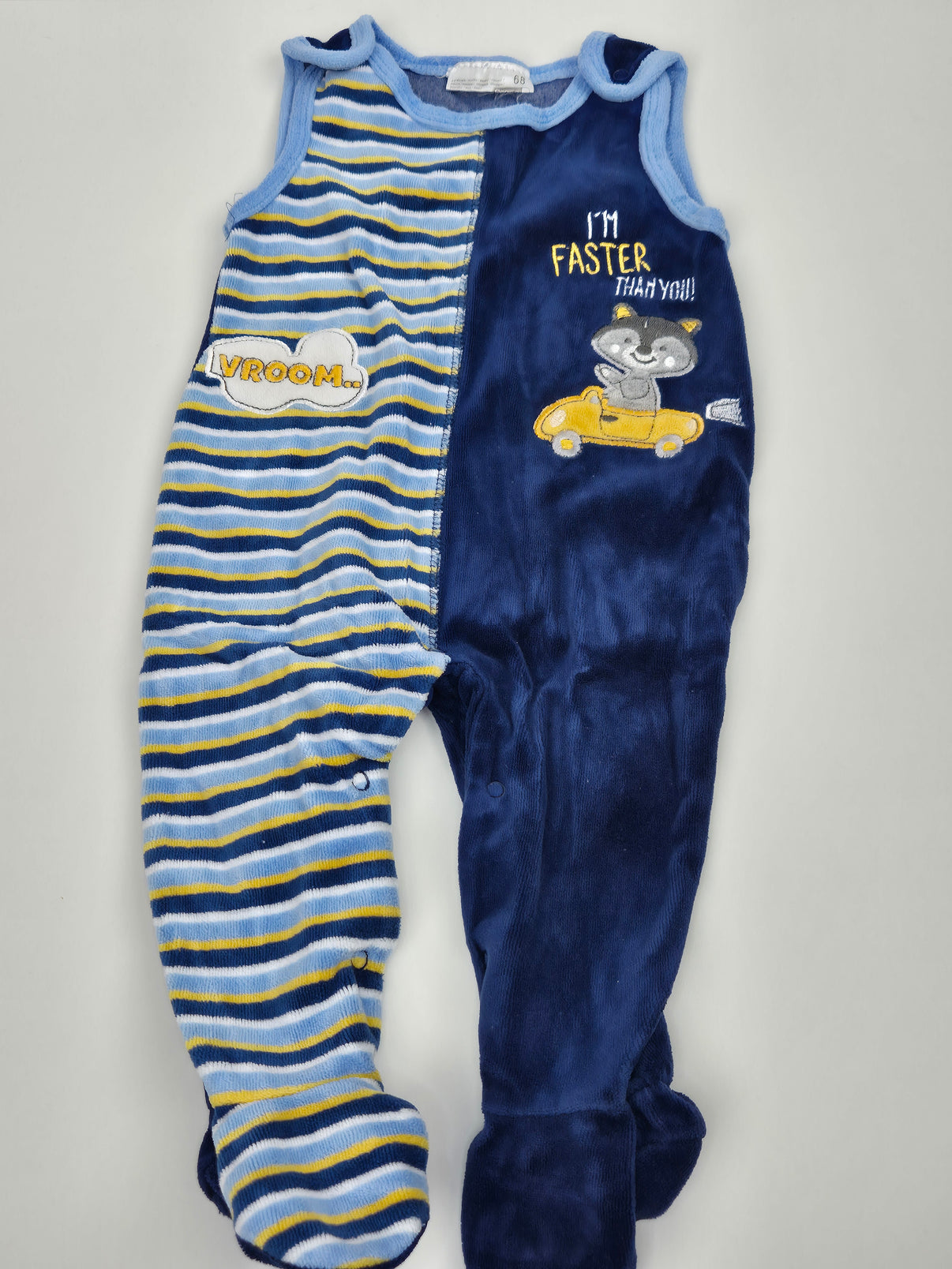 Měkké sametové dupačky značky Ergee v kombinaci tmavě modré a proužkovaného vzoru v odstínech modré, žluté a bílé. Přední část zdobí veselý motiv zvířátka v autíčku s nápisem „I’m faster than you!!“ a výšivkou „Vroom…“. Pohodlný střih s integrovanými ťapkami udrží nožičky v teple, zapínání na ramínkách a po straně nohavic usnadňuje oblékání i přebalování.