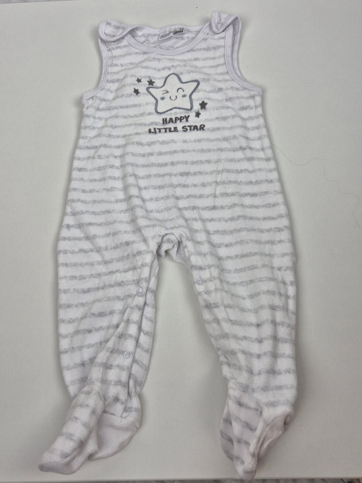 Bílé dupačky Ergee ve velikosti 68 s šedými proužky jsou vyrobené z měkkého a hřejivého materiálu, ideálního pro pohodlný spánek i denní nošení. Na přední straně je roztomilá aplikace hvězdičky s nápisem „Happy little star“, která dodává dupačkám hravý vzhled. Integrované ťapky udrží nožičky miminka v teple. Univerzální kousek vhodný pro holčičku i chlapečka.