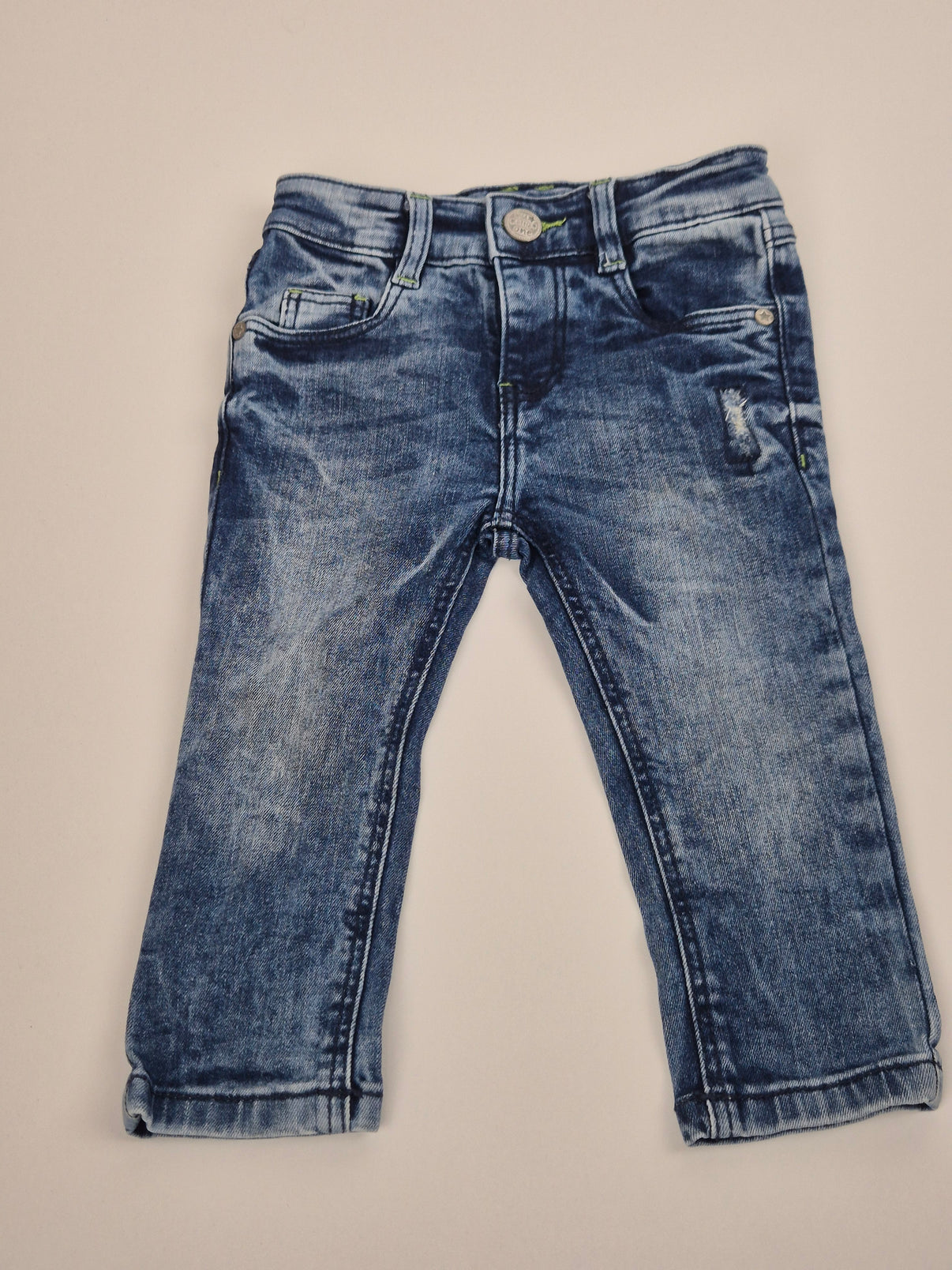 Stylové džíny značky Dopodopo v tmavším modrém tónu s výraznějším opraným efektem a decentními oděrkami. Kalhoty mají klasický střih se zapínáním na knoflík a poutky na pásek, což jim dodává „dospělácký“ vzhled. Zelené detaily ve švech oživují celkový design. Zadní i přední kapsy jsou plně funkční. Ideální volba pro malé kluky, kteří chtějí být za frajery – hodí se na běžné nošení i na návštěvu.