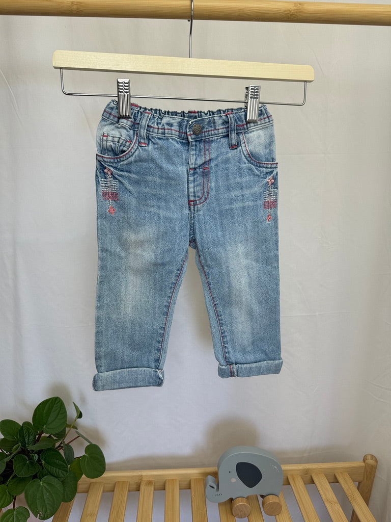 Dětské džíny značky Ergee ve velikosti 80. Mají stylový opraný vzhled a jsou ozdobeny jemnými výšivkami. Praktické kapsy na přední i zadní straně. Elastický pas zajišťuje pohodlné nošení, a proto jsou tyto kalhoty vhodné pro každodenní aktivity malých průzkumníků.