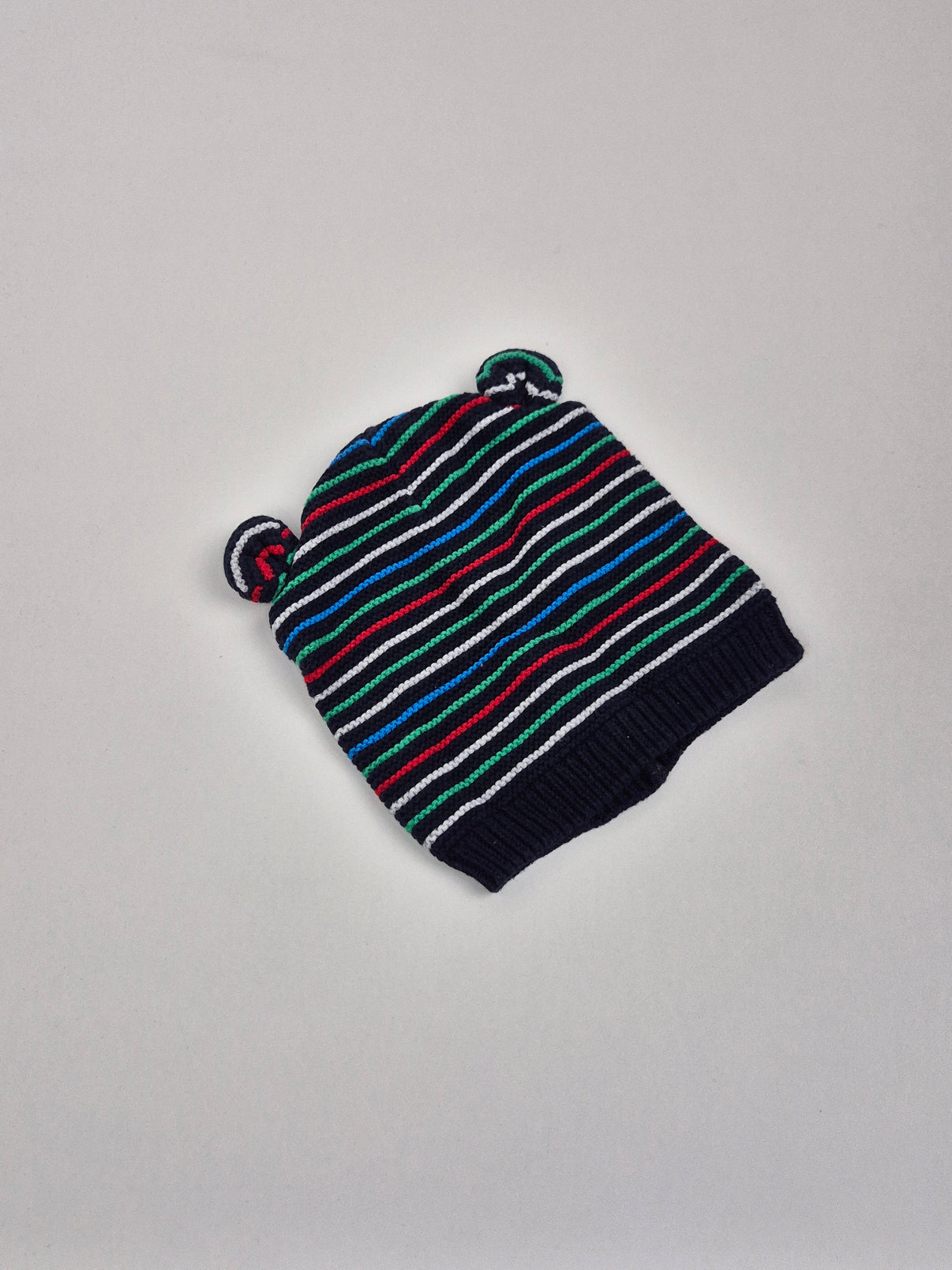 Dětská čepice ve velikosti 74/80 v hravém pruhovaném provedení, které hned zaujme. Základ tvoří tmavě modrá barva doplněná o tenké proužky v bílé, zelené, modré a červené, díky čemuž působí čepice veselým, ale stále vkusným dojmem. Roztomilým detailem jsou malé ouška na vrchu, které dodávají čepici dětský a mazlivý vzhled.