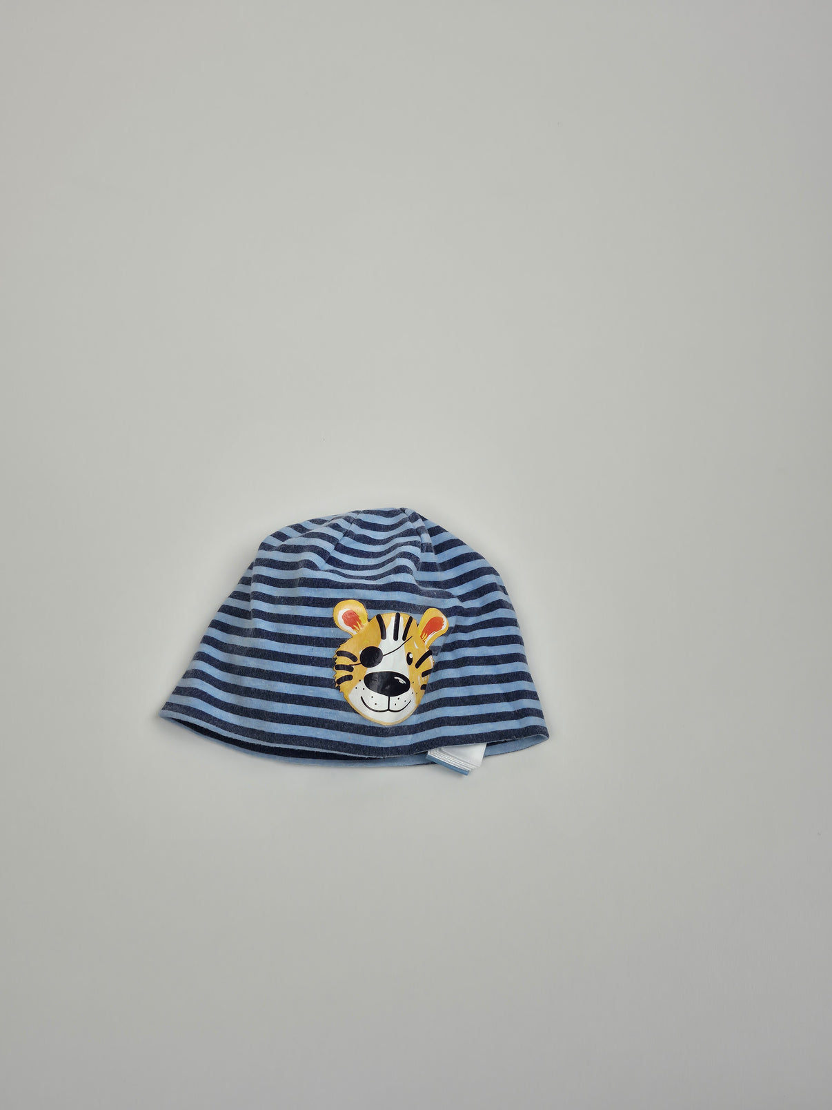 Jemná čepice Dopodopo v kombinaci tmavě modré a světle modré s pravidelnými proužky. Na přední straně je výrazná aplikace roztomilého tygříka v teplých žlutých a oranžových tónech, která čepičce dodává hravý a veselý vzhled.