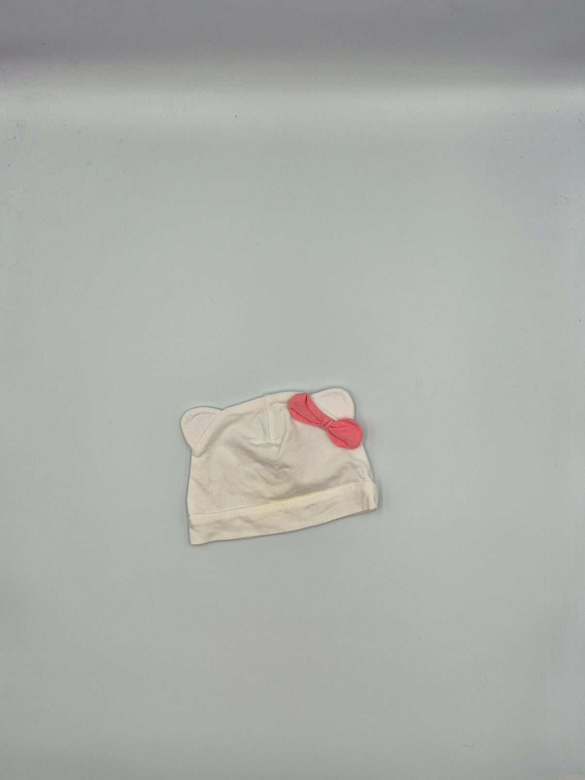 Roztomilá kojenecká čepička H&M ve velikosti 62 v jemné krémově bílé barvě, která působí velmi něžně a snadno se kombinuje s dalšími kousky dětského oblečení. Čepička je ozdobená malými oušky na vrchní části a doplněná růžovou mašličkou na boku, která dodává celému kousku hravý a roztomilý vzhled.