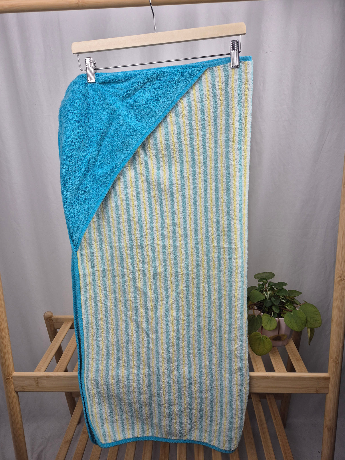 Hebká dětská osuška od značky Tchibo v krásném pruhovaném designu v odstínech tyrkysové, žluté a bílé s jemným lemováním v modré barvě. Díky praktické kapuci v rohu udrží po koupání hlavičku v teple a osuší i ty nejmenší kapičky. Ideální na doma do koupelny, k bazénu nebo na dovolenou k moři.