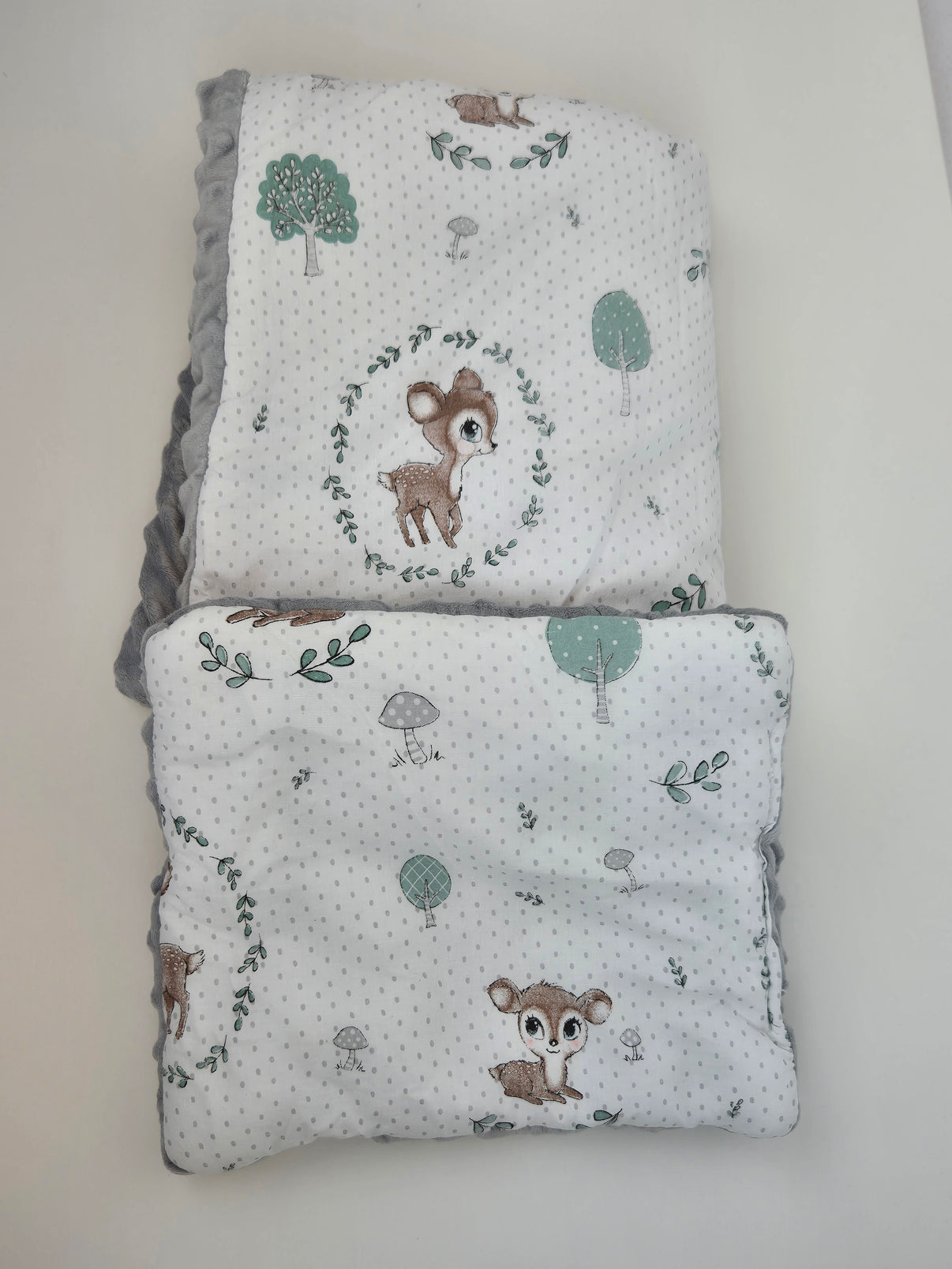 Velmi příjemně měkká sada peřinek do kočárku od značky BABYLUX, která zahrnuje deku o rozměrech 60×75 cm a polštářek 35×30 cm. Z jedné strany hebký minky materiál v šedé barvě s plastickými puntíky, z druhé strany jemná bavlna s roztomilým motivem lesních zvířátek. Uvnitř se nachází antialergická výplň, která zajišťuje pohodlí a bezpečnost pro miminko. Ideální do kočárku i postýlky.