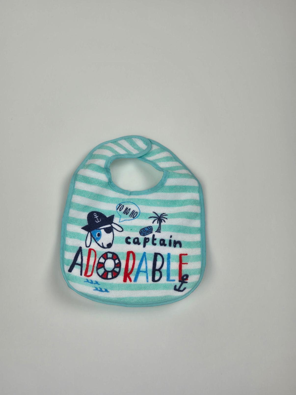 Veselý pruhovaný bryndák v tyrkysovo-bílé kombinaci s pirátským motivem a nápisem „Captain Adorable“. Přední stranu zdobí roztomilý pejsek s kapitánskou čepicí, plachetnice a palmy – ideální pro malé dobrodruhy. Zadní strana má nepromokavou úpravu, která pomáhá chránit oblečení před ušpiněním. Praktické zapínání na suchý zip za krkem umožňuje rychlé nasazení i sundání. Skvělý pomocník při krmení i prvních pokusech o samostatné papání.