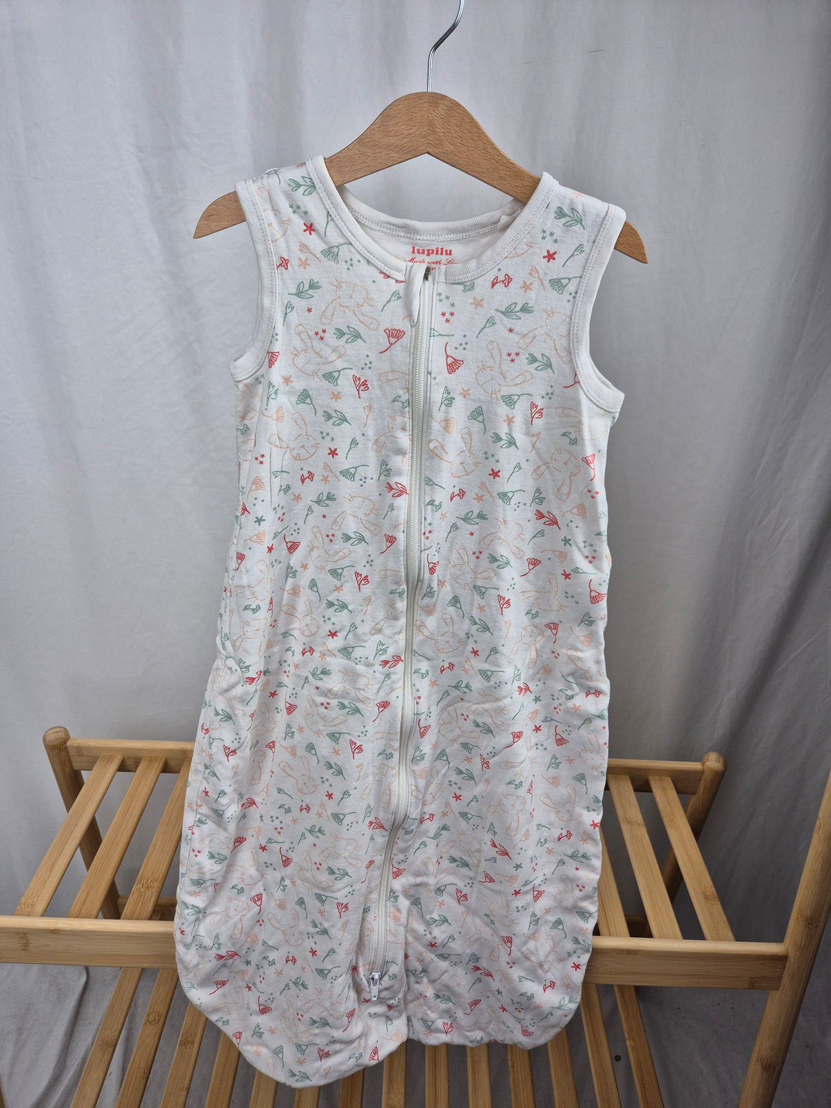 Lehký spací pytel pro miminko v bílé barvě s jemným potiskem květin, lístků a motýlků v pastelových odstínech zelené, růžové a béžové. Praktický zip po celé délce umožňuje snadné oblékání i noční přebalování. Pohodlný střih zajistí klidný a bezpečný spánek bez nutnosti přikrývky.