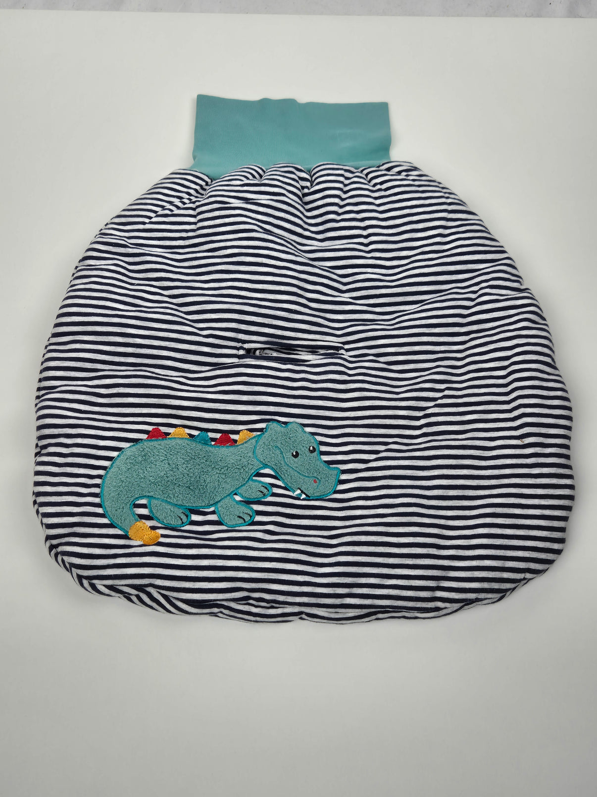 Pohodlný a teplý vak do autosedačky s roztomilou výšivkou modrozeleného dráčka od značky Sterntaler. Pruhovaný vzor v tmavě modré a bílé barvě doplňuje kontrastní pas v mentolovém odstínu, který jemně obepíná a chrání miminko před chladem. Praktický otvor pro bezpečnostní pásy usnadňuje upevnění do autosedačky. Ideální pro chlapečka na cesty v chladnějším počasí.