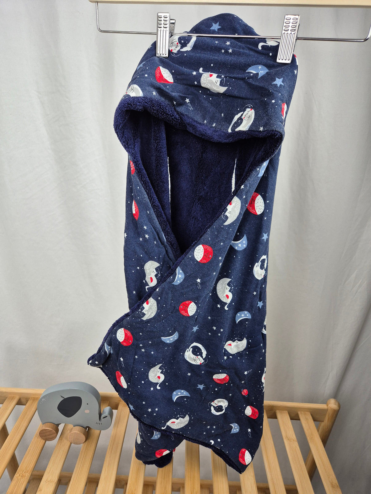 Praktická zavinovačka do autosedačky značky Kaars Garen v tmavě modré barvě s motivem měsíčků, hvězd a spících medvídků. Uvnitř je měkký a hřejivý fleece, který zajistí miminku pohodlí během cestování i v chladnějším počasí. Díky otvorům na zadní straně je možné zavinovačku jednoduše upevnit do autosedačky či kočárku. Kapuce poskytne miminku dodatečné teplo a ochranu. Vhodná pro holčičky i chlapečky.