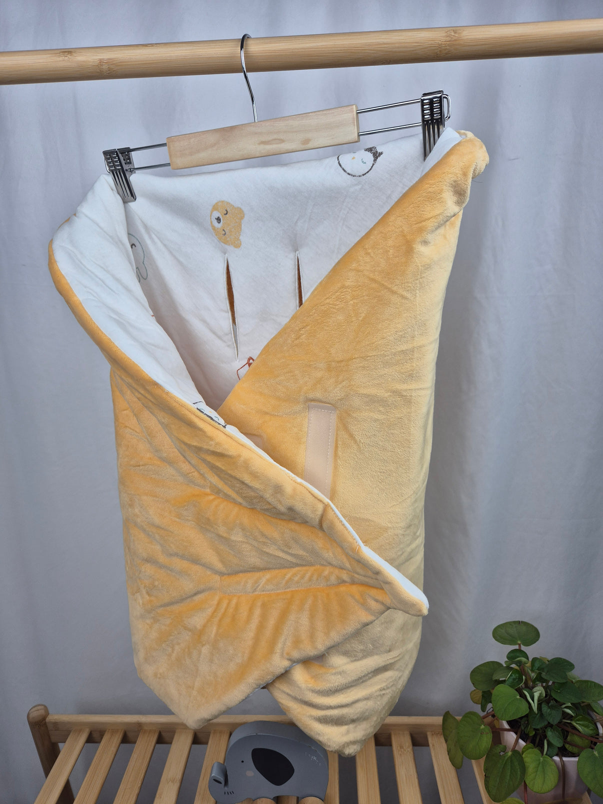 Měkoučká zavinovačka do autosedačky z Pepco ve velikosti 85x85 cm je ideální volbou pro pohodlné a bezpečné cestování s miminkem. Vnější strana v teplém medově žlutém odstínu je z příjemného plyšového materiálu, vnitřní strana je bílá s roztomilým potiskem zvířátek. Díky předpřipraveným otvorům na bezpečnostní pásy lze zavinovačku snadno použít v autosedačce i kočárku. Praktické zapínání na suchý zip usnadňuje manipulaci.