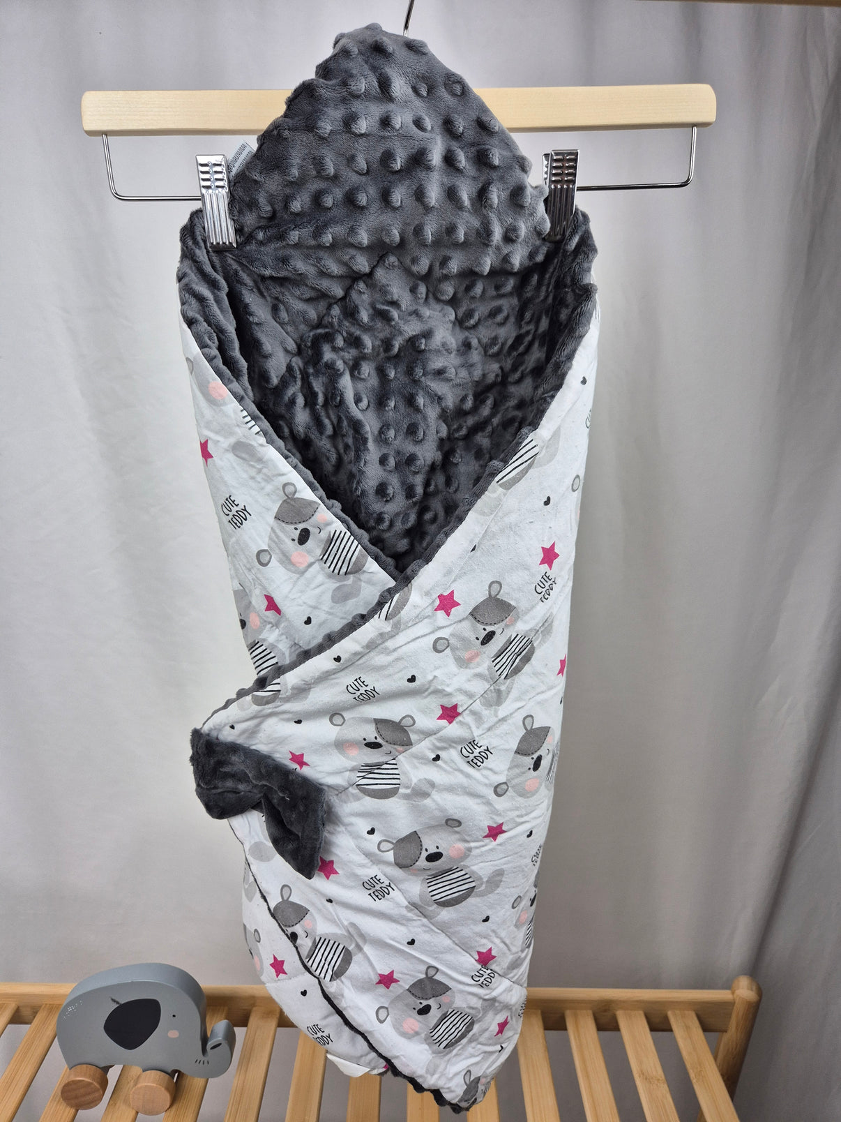Oboustranná zavinovačka značky New Baby nabízí dva vzhledy v jednom – z jedné strany jemný bílý bavlněný povrch s potiskem medvídků, růžových hvězdiček a nápisem „Cute Teddy“, z druhé strany měkoučký šedý minky materiál s 3D tečkovanou strukturou. Lze ji snadno přetočit podle nálady či příležitosti. Skvěle zahřeje a poskytne miminku útulné a bezpečné prostředí doma i na cestách.