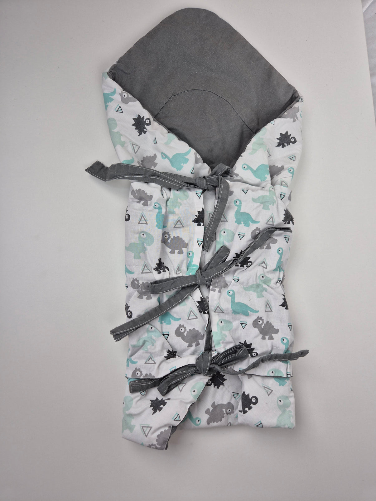 Roztomilá a praktická zavinovačka s motivem dinosaurů, ideální pro chlapečka i holčičku. Vnější část zdobí potisk v jemných odstínech šedé, mentolové a černé, zatímco vnitřek je z hebkého jednobarevného šedého materiálu. Zavazování na tři mašličky zajistí snadné zavinutí i rozbalení. Skvělý pomocník do postýlky, kočárku i na nošení v náručí – pro pohodlné a klidné začátky života tvého miminka.