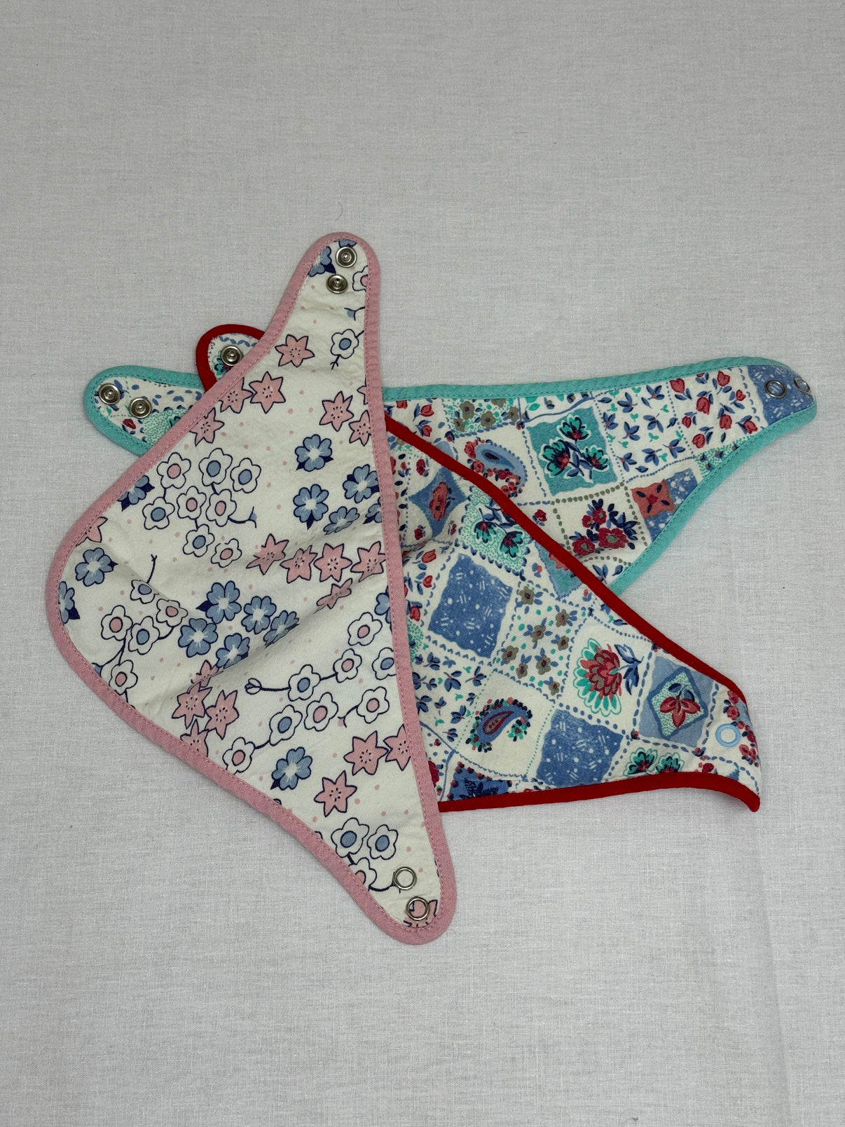Sada tří roztomilých slintáčků pro holčičku, každý s různými vzory a barevnými kombinacemi. Slintáčky jsou zdobené květinovými a patchworkovými motivy v jemných pastelových barvách, jako je růžová, modrá a červená. Vyrobeny z měkké a savé bavlny, která je šetrná k dětské pokožce a zároveň účinně chrání oblečení před vlhkostí. Každý slintáček má praktické zapínání na patentky, které umožňuje snadné přizpůsobení velikosti. Perfektní volba pro holčičky během jídla nebo při růstu zoubků, která zajišťuje jak styl, tak funkčnost.