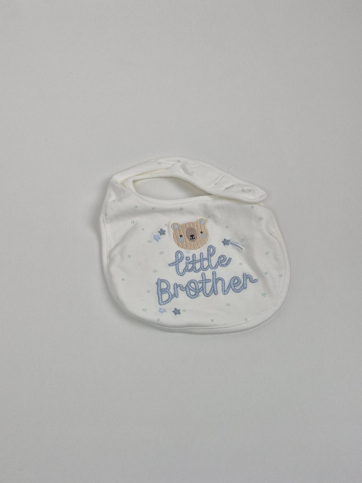 Dětský bryndák v jemném krémově bílém odstínu s roztomilou výšivkou medvídka a nápisem Little Brother. Drobné hvězdičky v pastelově modré barvě dodávají bryndáku něžný a hravý vzhled, ideální pro miminka. Barevnost působí klidně a čistě, skvěle ladí s ostatní výbavou pro nejmenší.