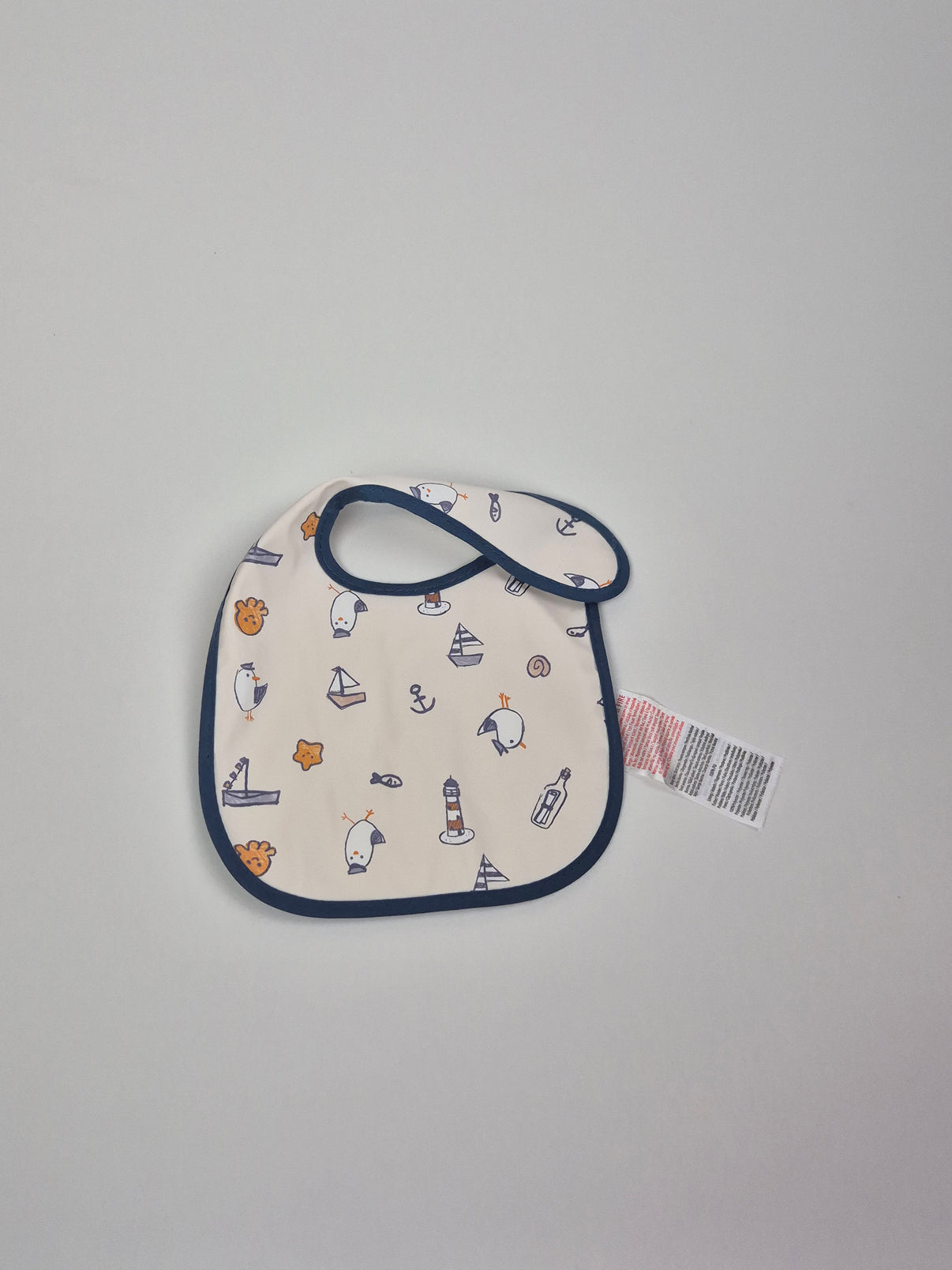 Látkový bryndák v jemném krémovém odstínu s roztomilými námořnickými ilustracemi – lodičky, maják, kotvičky a ptáčci. Tmavě modré lemování mu dodává hezký kontrast a praktické zapínání na suchý zip usnadní oblékání i svlékání. Ideální pomocník na krmení doma i na cestách, který ochrání oblečení před nehodami.