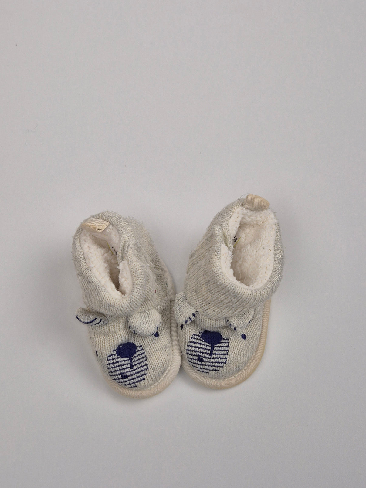 Roztomilé pletené capáčky Marks & Spencer ve světlém šedém melíru s krémovým podkladem, doplněné o tmavě modrý obličej medvídka a drobné detaily. Uvnitř jsou měkce zateplené, takže krásně zahřejí malé nožičky v chladnějších dnech.