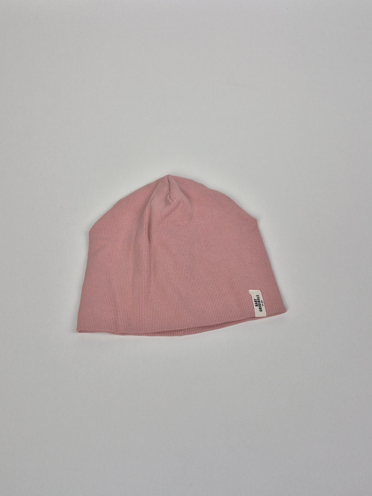 Stylová žebrovaná čepice H&M ve velikosti 74/80, vhodná pro miminka a batolata. Vyrobená z měkké, pružné bavlny, díky které dobře sedí a je pohodlná při nošení. Jemně růžová barva s drobnou nášivkou dodává čepici roztomilý vzhled.