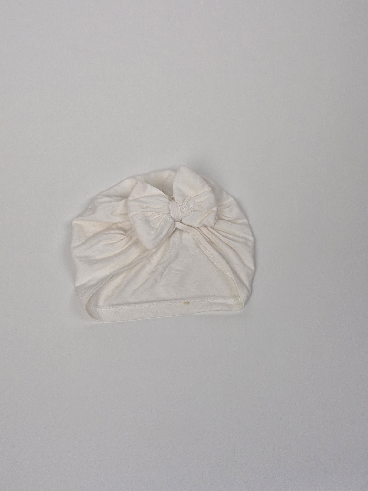 Stylová čepice ve tvaru turbanu pro miminko ve velikosti 68/74. Vyrobená z měkké, lehce pružné bavlny v jemné bílé barvě. Přední část zdobí velká mašle, která dodává čepici elegantní a roztomilý vzhled. Díky příjemnému materiálu je pohodlná na nošení a skvěle doplní každý outfit – ať už ke šatičkám, nebo k body.