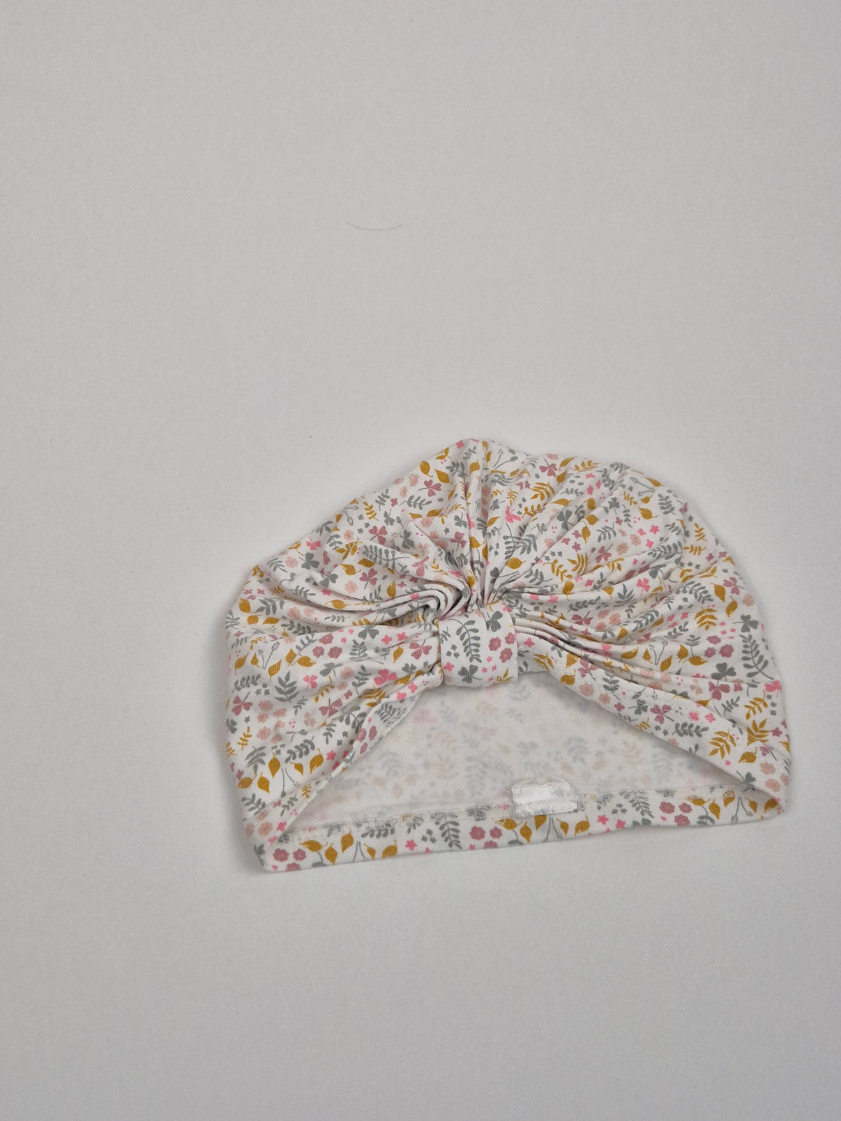 Stylová turbanová čepice v jemném krémově bílém základu s drobným květinovým a lístkovým potiskem v pastelových tónech růžové, hořčicové a šedé. Měkký a pružný materiál je příjemný na nošení a dobře se přizpůsobí hlavičce dítěte. Výrazný uzel vpředu dodává čepici moderní a zároveň roztomilý vzhled. Skvělá volba na běžné nošení, do kočárku i jako stylový doplněk outfitu.