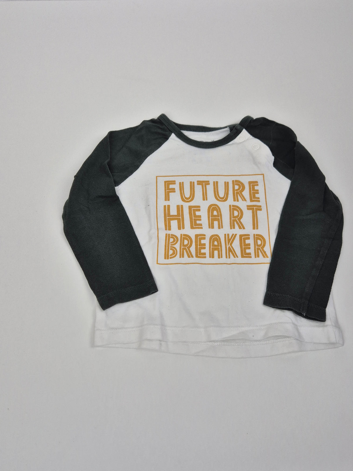 Stylové tričko značky F&F ve velikosti 80 s dlouhým rukávem v kontrastní kombinaci bílého základu a tmavě zelených rukávů. Na přední straně je nápis „FUTURE HEART BREAKER“ v hořčicově žluté barvě, který dodává tričku moderní a vtipný vzhled. Vyrobené z měkké bavlny, příjemné pro dětskou pokožku. Na rameni je praktické zapínání na patentky pro snadné oblékání. Ideální kousek pro malé rošťáky s velkým srdcem. 💛