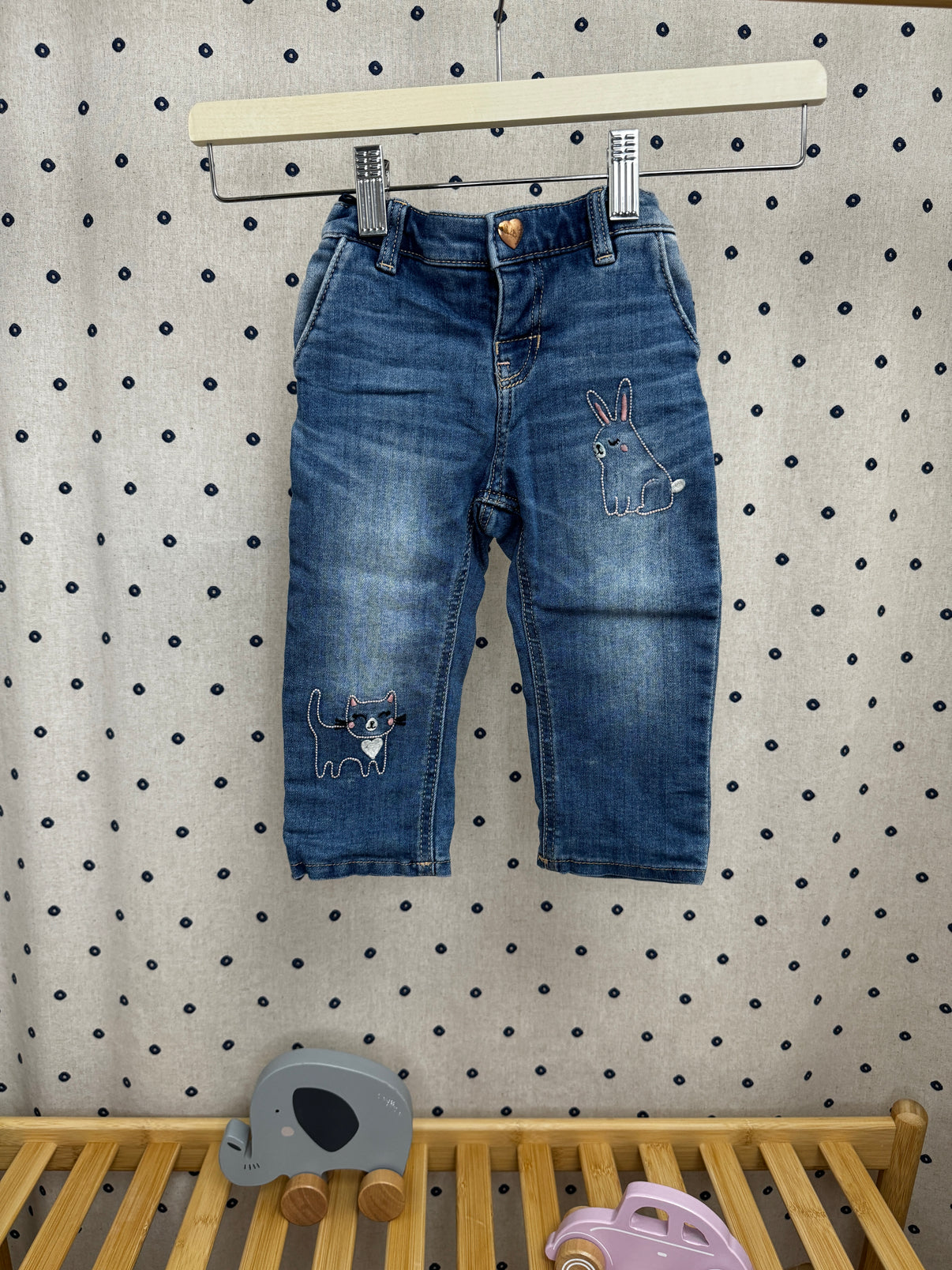 Tyto elastické džíny ve velikosti 80 od značky H&M jsou perfektní volbou pro malé děti, které potřebují volnost pohybu a pohodlí. Džíny mají klasický modrý džínový vzhled s jemným opraným efektem a jsou podšité měkkou bavlnou, což poskytuje extra teplo a komfort. Roztomilé výšivky zvířátek, jako je králíček a kočička, dodávají kalhotám hravý a stylový vzhled. Elastický pas a praktické zapínání na srdíčkový knoflík zajišťují pohodlné oblékání a nošení. Tyto džíny jsou ideální pro každodenní nošení, ať už doma nebo venku, a udrží vaše děťátko v pohodlí a stylu.