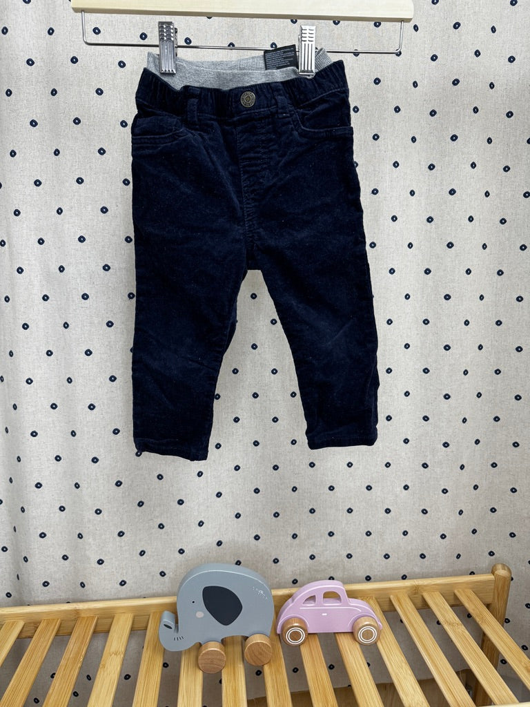 Stylové manšestrové kalhoty od značky H&M ve velikosti 86 jsou perfektní volbou pro malé chlapce. Tmavě modrý manšestr působí elegantně, ale zároveň pohodlně díky elastickému pasu s šedým lemem, který se snadno přizpůsobí. Kalhoty mají klasické kapsy a knoflík, což přidává na jejich praktickém a stylovém vzhledu. Jsou ideální na každodenní nošení do města, školky nebo na procházky, kdy se malý nositel bude cítit pohodlně a vypadat skvěle.