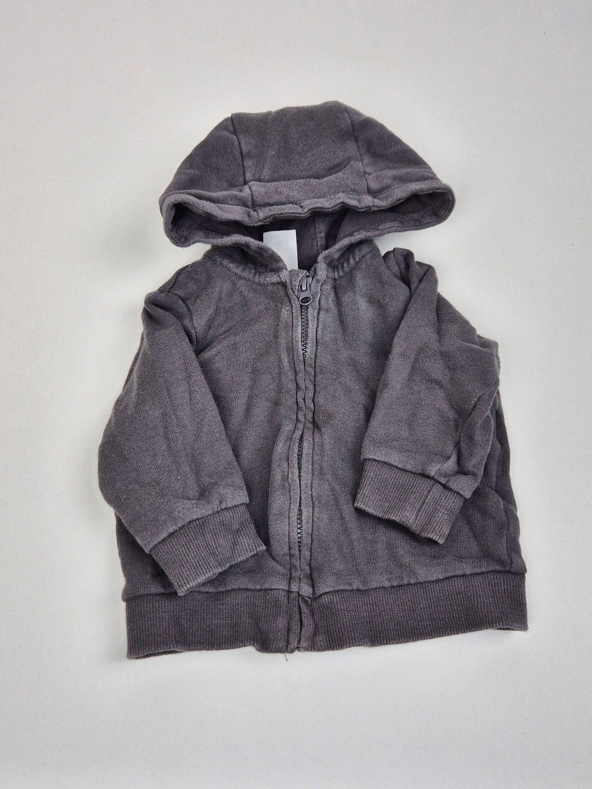 Měkká bavlněná mikina H&M ve velikosti 62 v neutrální šedé barvě. Má kapuci, žebrované lemy a zapínání na zip – ideální na běžné nošení i jako lehčí vrstva na ven.