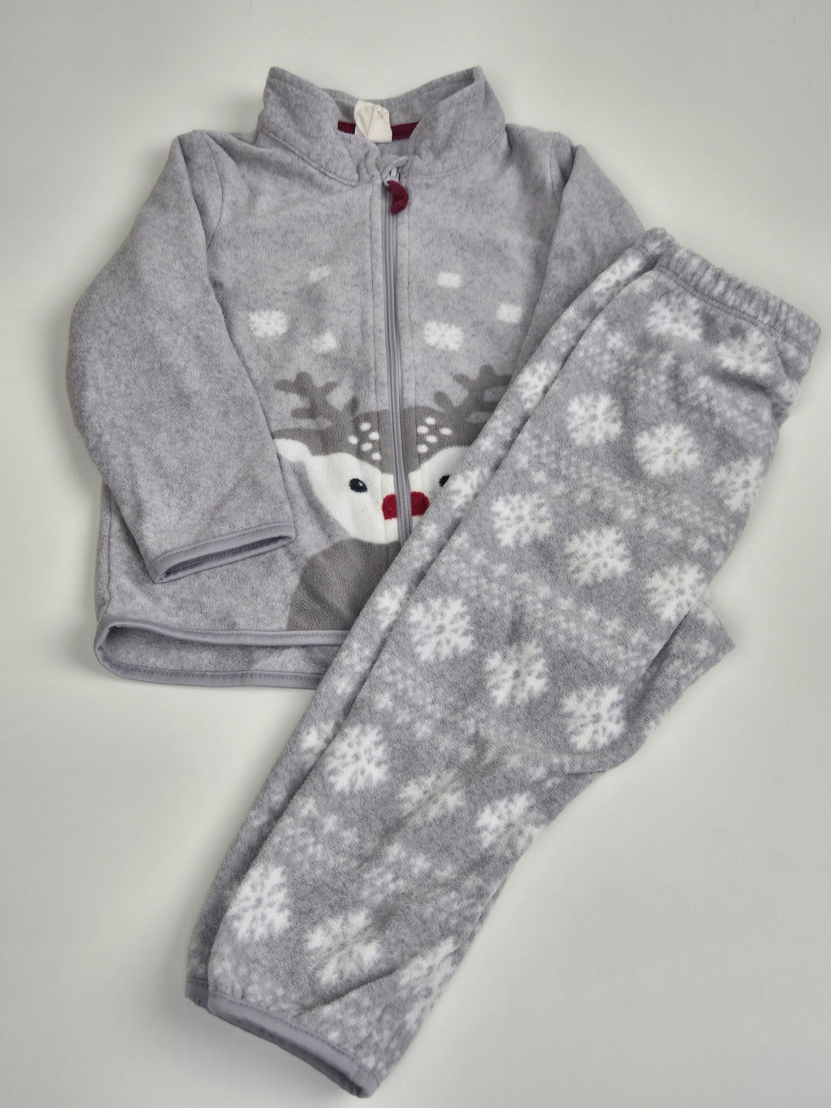 Měkoučká tepláková souprava značky H&M v jemné světle šedé barvě s roztomilým zimním motivem. Mikina na zip má stojáček, který hezky zahřeje krk, a přední část zdobí veselý sobík. Kalhoty s pružným pasem jsou pohodlné na nošení a poseté bílými vločkami, které dodávají soupravě hravý vzhled. Hebký fleecový materiál je ideální na chladnější dny doma, do kočárku i na pohodové nošení venku.