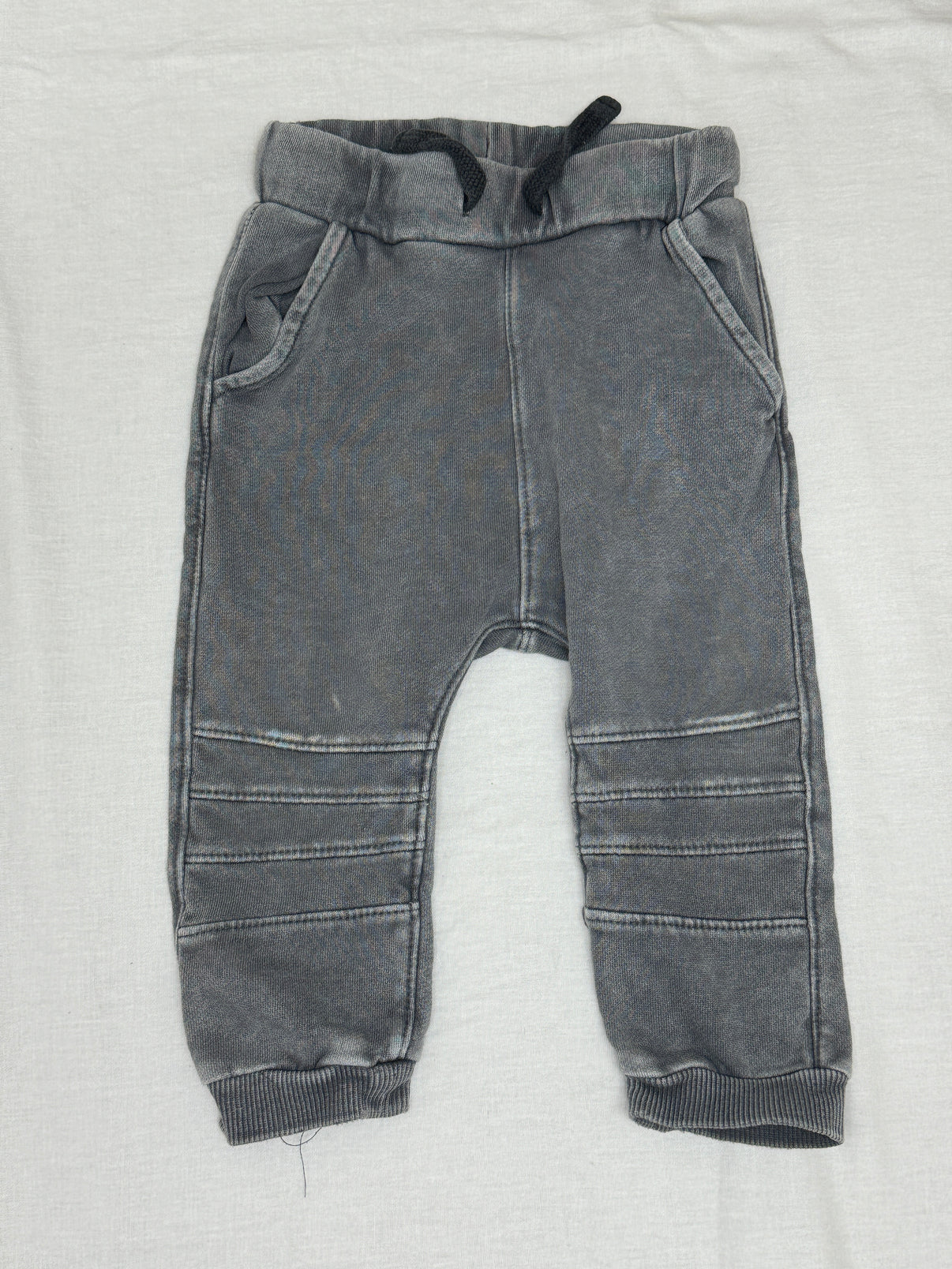Šedé tepláky značky H&M ve velikosti 80 jsou ideální pro malé objevitele. Mají moderní, lehce opraný vzhled a praktické detaily jako jsou žebrované manžety na nohavicích a stahovací šňůrka v pase. Tepláky mají přední kapsy a efektní prošívání na kolenou, které dodává stylový vzhled a zároveň nabízí pohodlí pro volný pohyb. Perfektní volba pro každodenní nošení doma i venku.