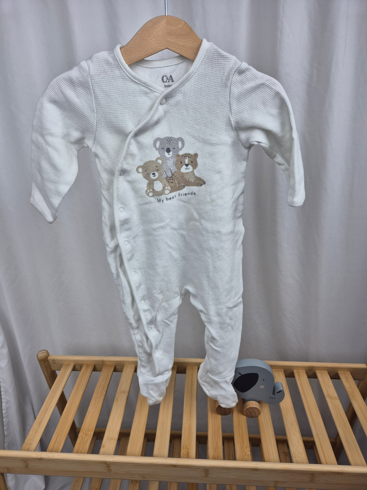 Měkoučké bílé dupačky C&A pro pohodlí každého miminka. Celopropínací zapínání na patentky usnadní oblékání i rychlé přebalování. Jemná struktura materiálu je příjemná k pokožce a ideální na celodenní nošení. Přední stranu zdobí roztomilý potisk tří medvídků s nápisem My best friends, který dodává outfitu milý a hravý vzhled. Díky neutrální barvě se skvěle hodí pro holčičku i chlapečka.