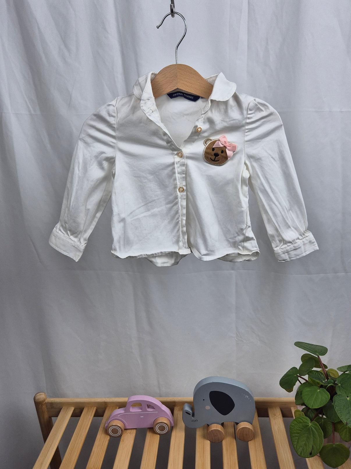 Roztomilá bílá košile s dlouhým rukávem značky Original Marines ve velikosti 74 je perfektní volbou pro malé princezny. Na hrudi ji zdobí výšivka medvídka s růžovou mašličkou, která dodává jemný a elegantní nádech. Díky zapínání na knoflíčky je oblékání snadné a pohodlné. Skvělá volba na slavnostní příležitosti i běžné nošení! 🐻🎀💖