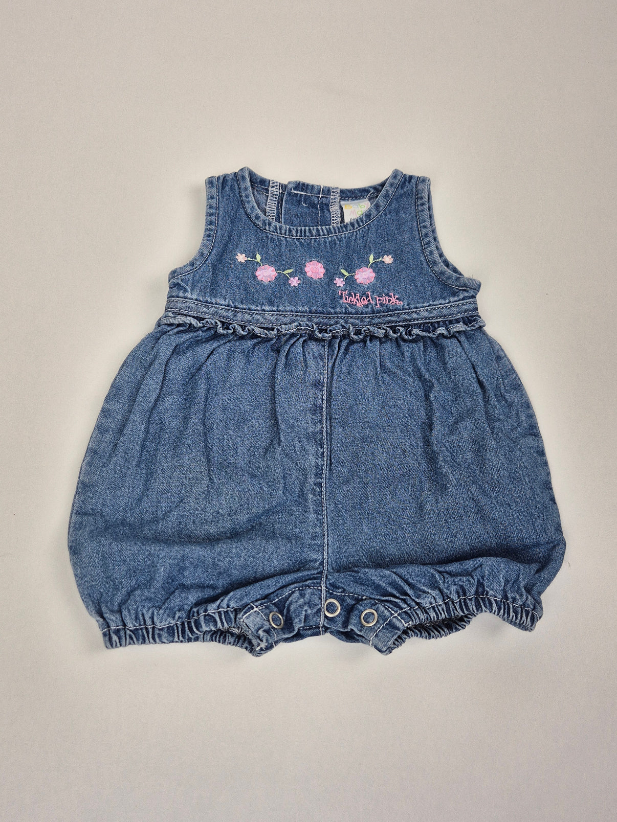 Roztomilý džínový overal Baby Mac s růžovou květinovou výšivkou a volánkem v pase. Díky zapínání mezi nožičkami se snadno obléká a je ideální pro malé princezny v prvních měsících. Lehká a měkká džínovina zajistí pohodlí po celý den – perfektní volba na jaro či léto.