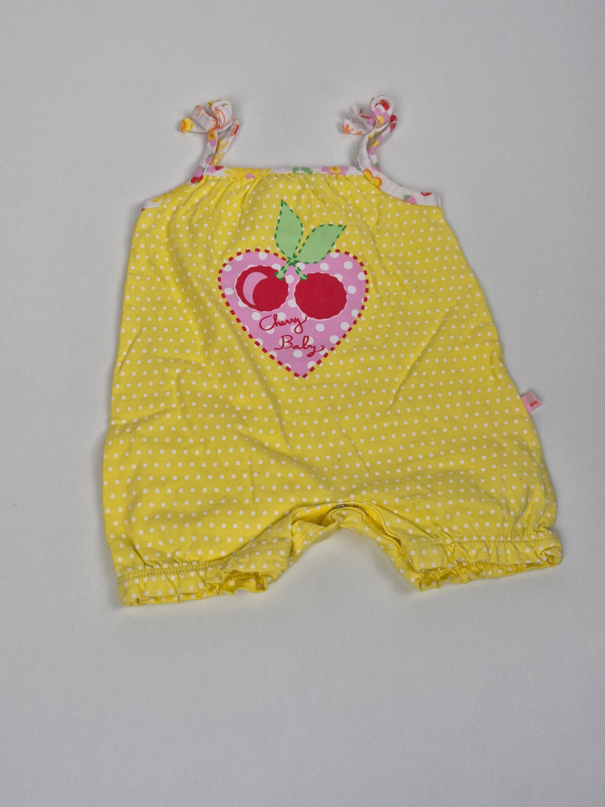 Overálek je žlutý s bílými puntíky a na přední straně ho zdobí velké srdíčko s třešničkami a nápisem „Cherry Baby“.