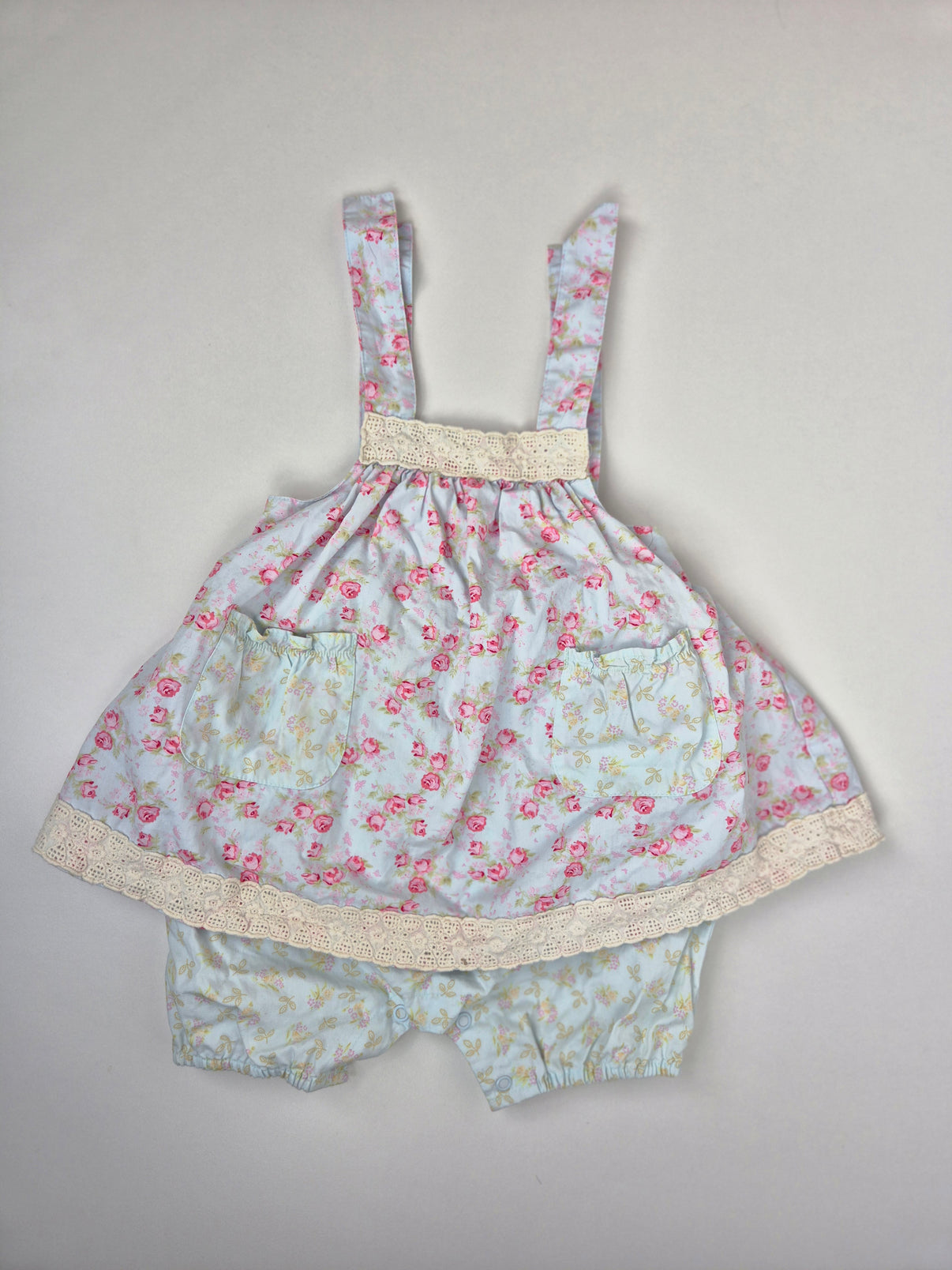Kouzelné letní body-šaty / kraťasový overal se sukénkou značky Molly n' Jack v jemném pastelově modrém odstínu s květinovým vzorem. Ozdobený krajkou v krémové barvě, dvěma kapsičkami vpředu a ramínky na knoflíčky. Spodní část tvoří kraťásky s gumičkami a praktickým zapínáním na patentky mezi nožičkami. Ideální outfit pro horké dny – elegantní i pohodlný zároveň.