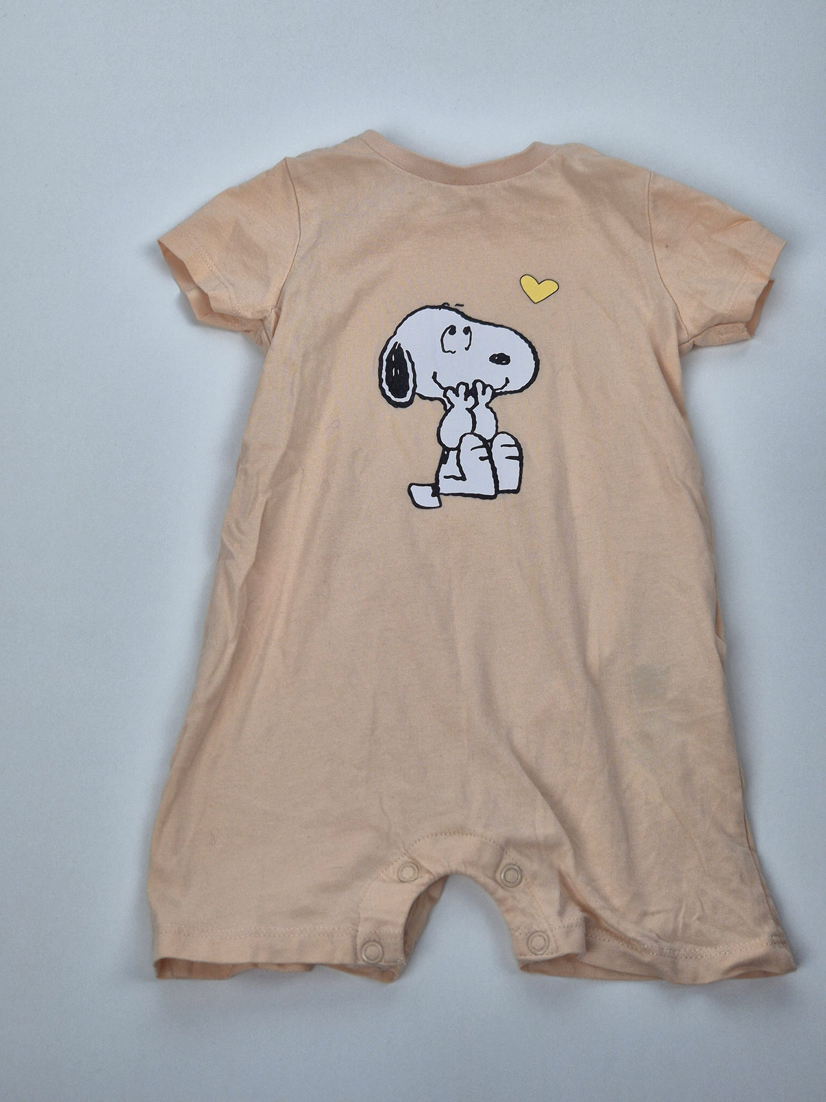 Pohodlný kraťasový overal ve světle meruňkové barvě s roztomilým potiskem Snoopyho a žlutého srdíčka. Praktické zapínání mezi nožičkami usnadňuje přebalování, zatímco příjemný bavlněný materiál je ideální na teplé dny. Skvělý letní kousek pro holčičky i kluky.