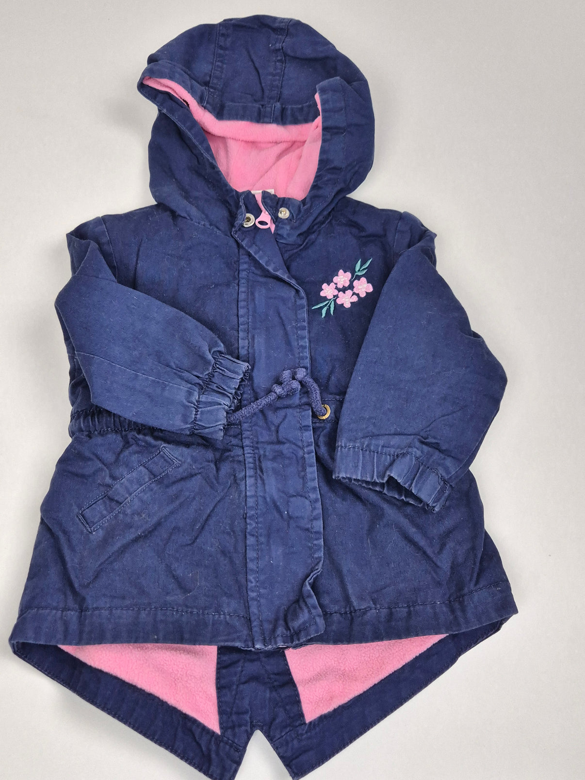 Praktický podšitý kabátek v tmavě modrém odstínu s jemným vyšisováním, který působí sportovně i roztomile zároveň. Uvnitř je hřejivá růžová fleecová podšívka, která krásně kontrastuje s tmavou vrchní částí a zajišťuje pohodlí v chladnějších dnech. Kapuce je pevnou součástí kabátu, rukávy mají stažení do gumy a pas lze lehce přizpůsobit pomocí šňůrky.