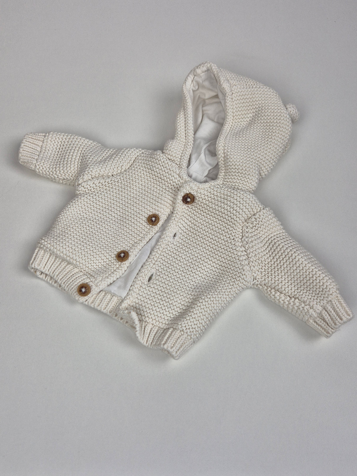 Stylový propínací svetr značky Marks & Spencer v jemném krémovém odstínu. Pletený z měkké bavlny, z vnější strany s výraznou strukturou a uvnitř s hebkou podšívkou pro extra pohodlí. Kapuce s malými oušky dodává svetříku roztomilý vzhled. Zapínání na dřevěné knoflíčky po celé délce usnadňuje oblékání.