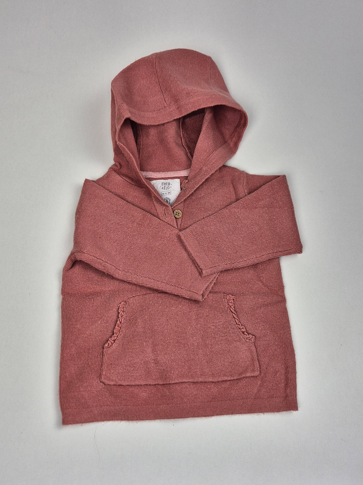 Hebký svetr s kapucí v jemném starorůžovém až pudrově malinovém odstínu. Materiál s jemnou strukturou působí měkce a příjemně na dotek, ideální pro citlivou dětskou pokožku. Praktická klokanková kapsa zahřeje ručičky a dodává svetru ležérní vzhled, malý knoflíček u krku usnadní oblékání. Skvělý kousek na běžné nošení – na doma, do kočárku i na procházky.