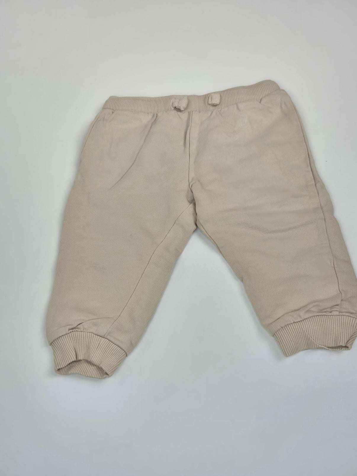 Měkké tepláčky v jemném béžovém odstínu, ideální na celodenní pohodlí malého objevitele. Příjemný, lehce strukturovaný materiál je hebký na dotek a díky pružným manžetám i pasu dobře drží na místě. Neutrální barva se krásně kombinuje a hodí se pro holčičku i chlapečka – perfektní volba do kočárku, na doma i na procházky.