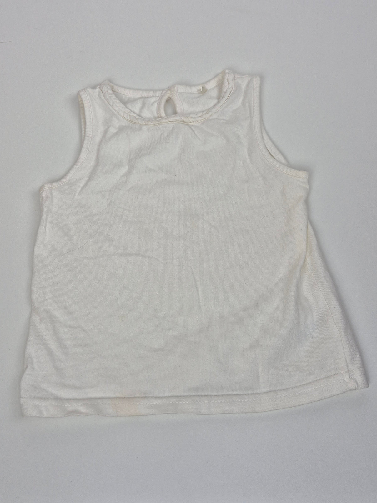 Lehoučké bílé tílko George pro malé slečny – ideální na teplé letní dny. Díky měkké bavlně je příjemné na těle a snadno se kombinuje s jakýmkoli outfitem. Jemný copánkový lem u výstřihu dodává tílku nádech jednoduché elegance. Skvělé jak na běžné nošení, tak i pod mikinu či svetřík.