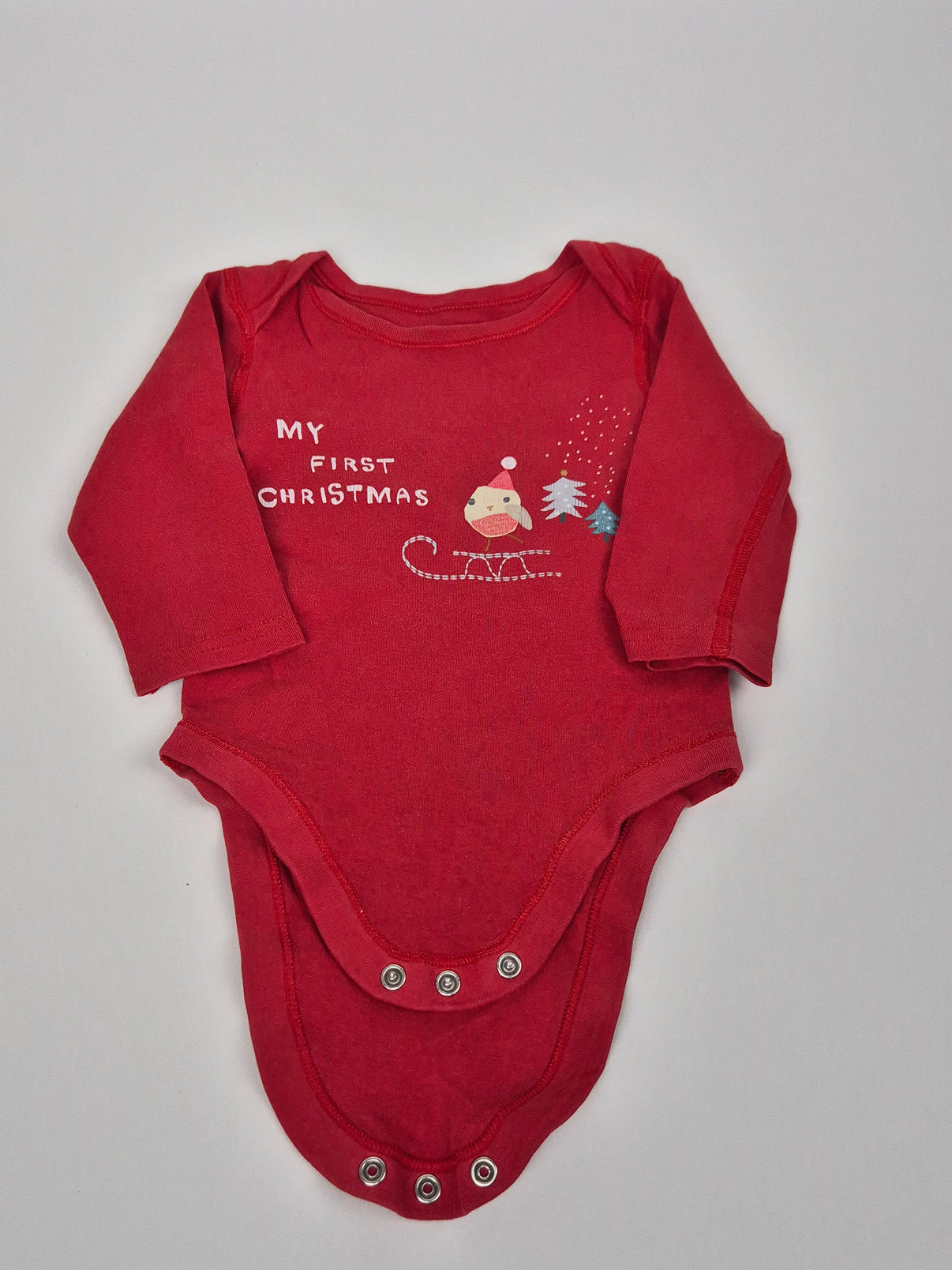 Body je červené, s dlouhým rukávem a nápisem „My First Christmas“ doplněným vánočním motivem (sáňky, stromečky, čepička). Vyrobené z měkké bavlny, která je příjemná k dětské pokožce. Má praktické zapínání na patentky v rozkroku pro snadné přebalování.