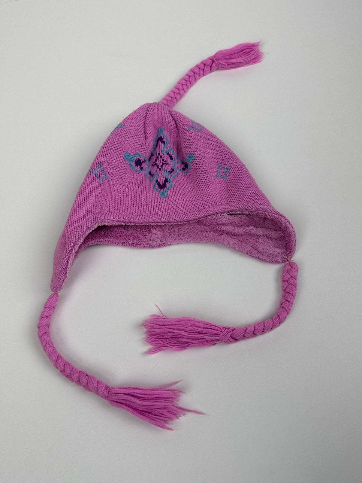 Pletená zimní čepice ve velikosti 110 v růžové barvě s modrým vzorem. Je podšitá měkkým fleecem pro větší hřejivost a má ouška s pletenými copánky, které chrání před chladem a větrem. Stylový a praktický kousek pro holčičku na zimní období.