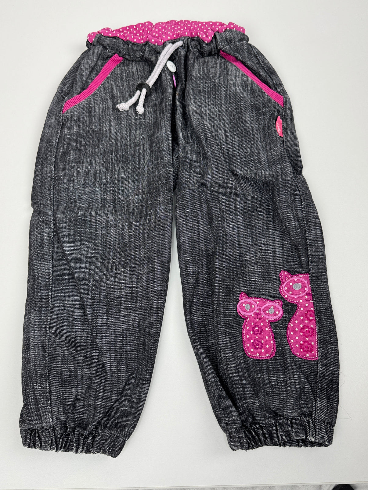 Kalhoty Dráče ve velikosti 98 v tmavě šedém odstínu s růžovými detaily. Mají pružný pas se stahovací šňůrkou a gumou v nohavicích, takže dobře sedí a jsou pohodlné na nošení. Přední nohavici zdobí roztomilé růžové kočičky, vzadu nechybí výšivka kytičky. Ideální na každodenní nošení pro holčičku.