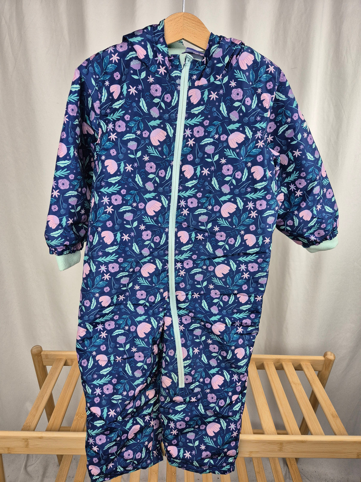 Krásná zimní kombinéza Lupilu ve velikosti 98. Zaujme svým barevným květinovým vzorem v odstínech modré, růžové, fialové a tyrkysové 🌸. Kombinéza má kapuci, zip po celé délce a elastické lemy...