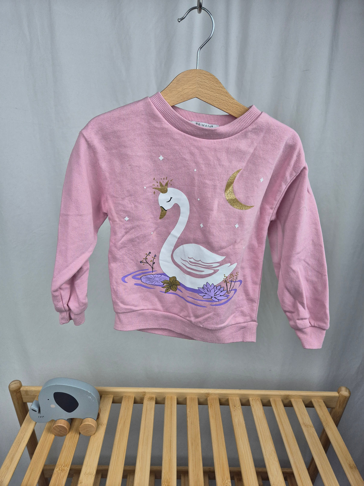 Krásná dívčí mikina Primark v jemně růžové barvě s potiskem labutě s korunou, měsíce a květinových detailů v odstínech zlaté, bílé a levandulové. Příjemný měkký materiál s vnitřní počesanou vrstvou zahřeje a zároveň je pohodlný na nošení. Praktické žebrované lemy na rukávech i spodním okraji zajistí, že mikina pěkně drží tvar.