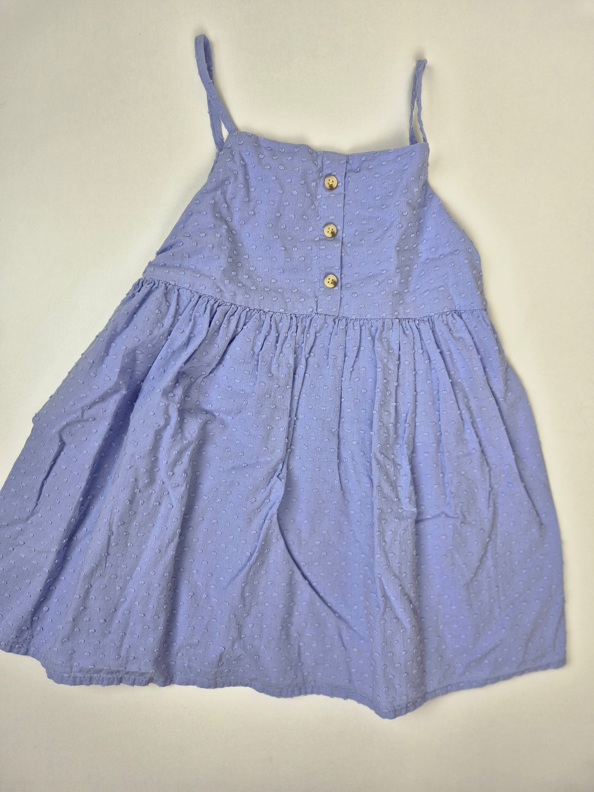 Světlounce levandulové dívčí šaty Reserved ve velikosti 104 – lehké, příjemné na nošení a perfektní na léto. Mají jemný strukturovaný puntíkatý vzor, tenká ramínka a ozdobnou knoflíkovou légu na hrudi. Sukénka je hezky nařasená, takže při chůzi krásně vlaje. Ideální kousek na běžné nošení, oslavy i letní výlety.