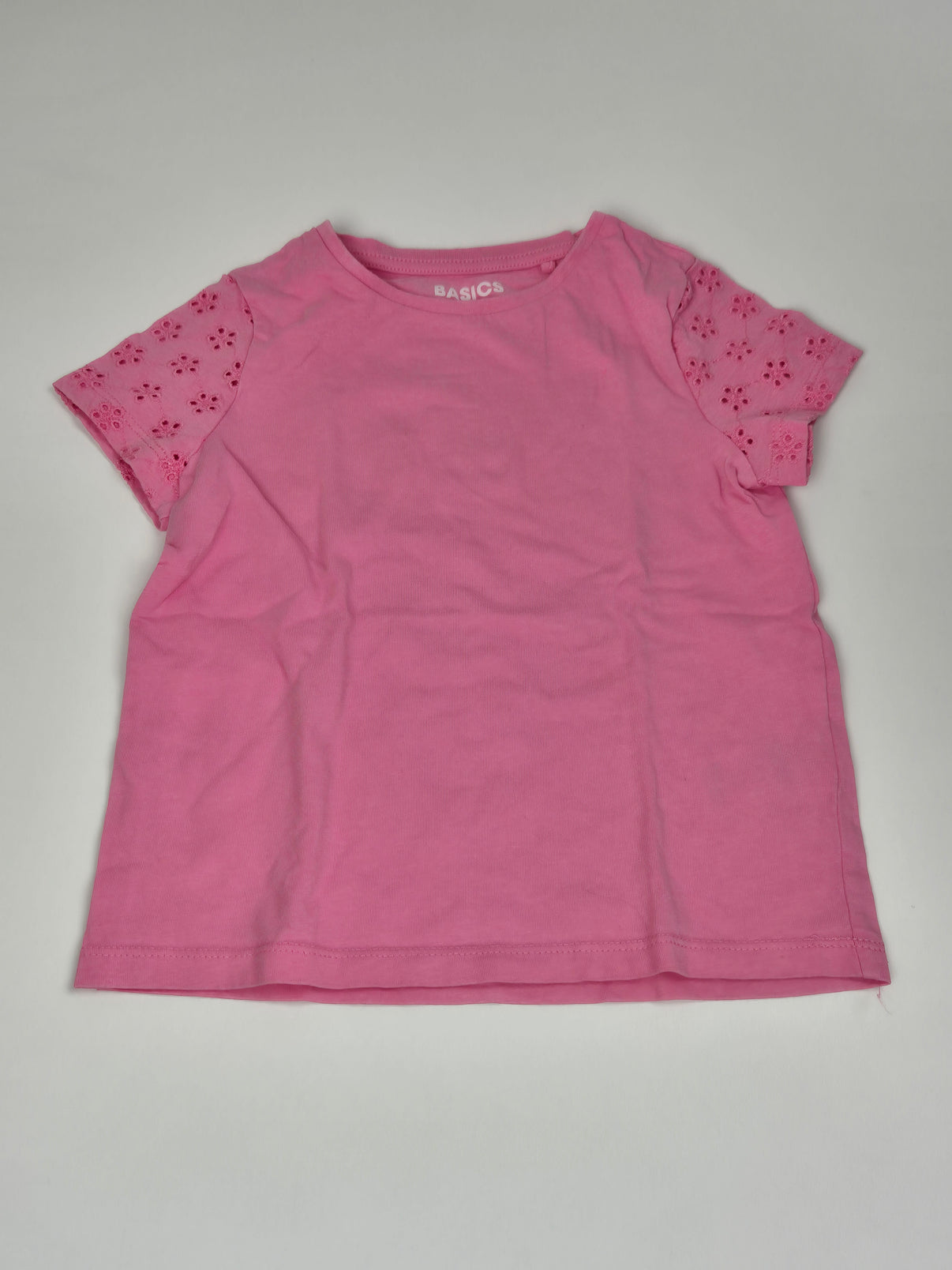 Světle růžové tričko F&F s krátkým rukávem je jemný a univerzální kousek do šatníku malé slečny. Výrazným detailem jsou krásné krajkové rukávky s výšivkou, které tričku dodávají svátečnější, ale stále pohodlný vzhled. Hodí se jak k sukni, tak k legínám nebo džínám – ideální do školky, na návštěvu i běžné denní nošení.