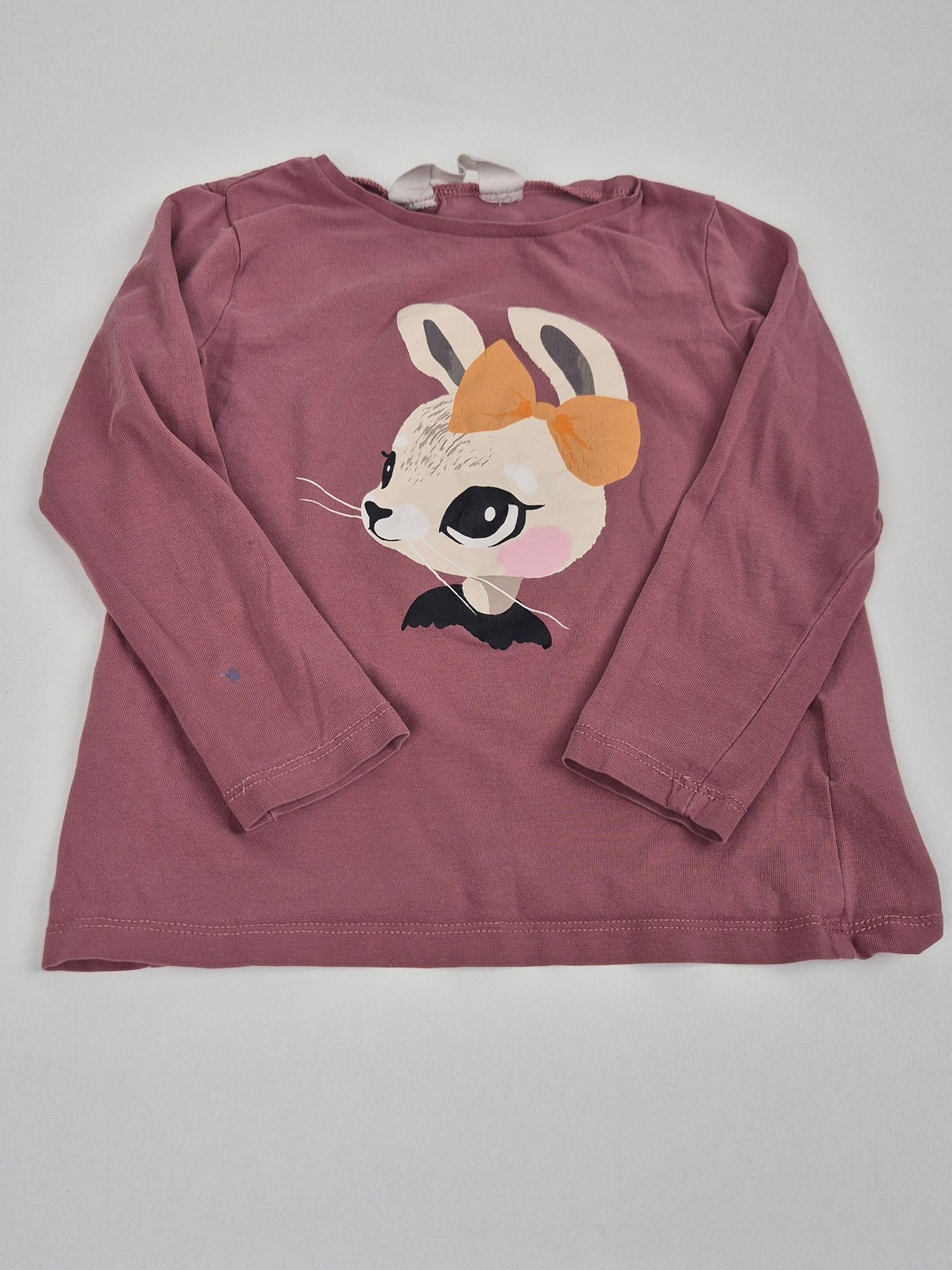 Roztomilé dívčí tričko H&M s dlouhým rukávem ve velikosti 98/104. Tričko je v jemně starorůžové barvě a zdobí ho krásný potisk králičí hlavičky s oranžovou mašlí – něžný motiv, který potěší každou malou parádnici.